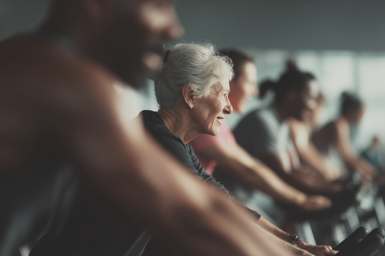 La imagen muestra un grupo diverso de personas montando bicicletas estáticas en un ambiente de gimnasio bien iluminado. En primer plano, se observa a una mujer mayor con cabello canoso, que parece disfrutar de la actividad mientras sonríe. Su expresión refleja concentración y satisfacción. Detrás de ella, otros ciclistas, en su mayoría fuera de foco, indican una variedad de edades y características, aunque sus detalles no son claros. La atmósfera del lugar sugiere energía y camaradería, con luz natural que entra a través de amplios ventanales. La escena enfatiza la inclusión y la importancia del ejercicio, sin importar la edad.