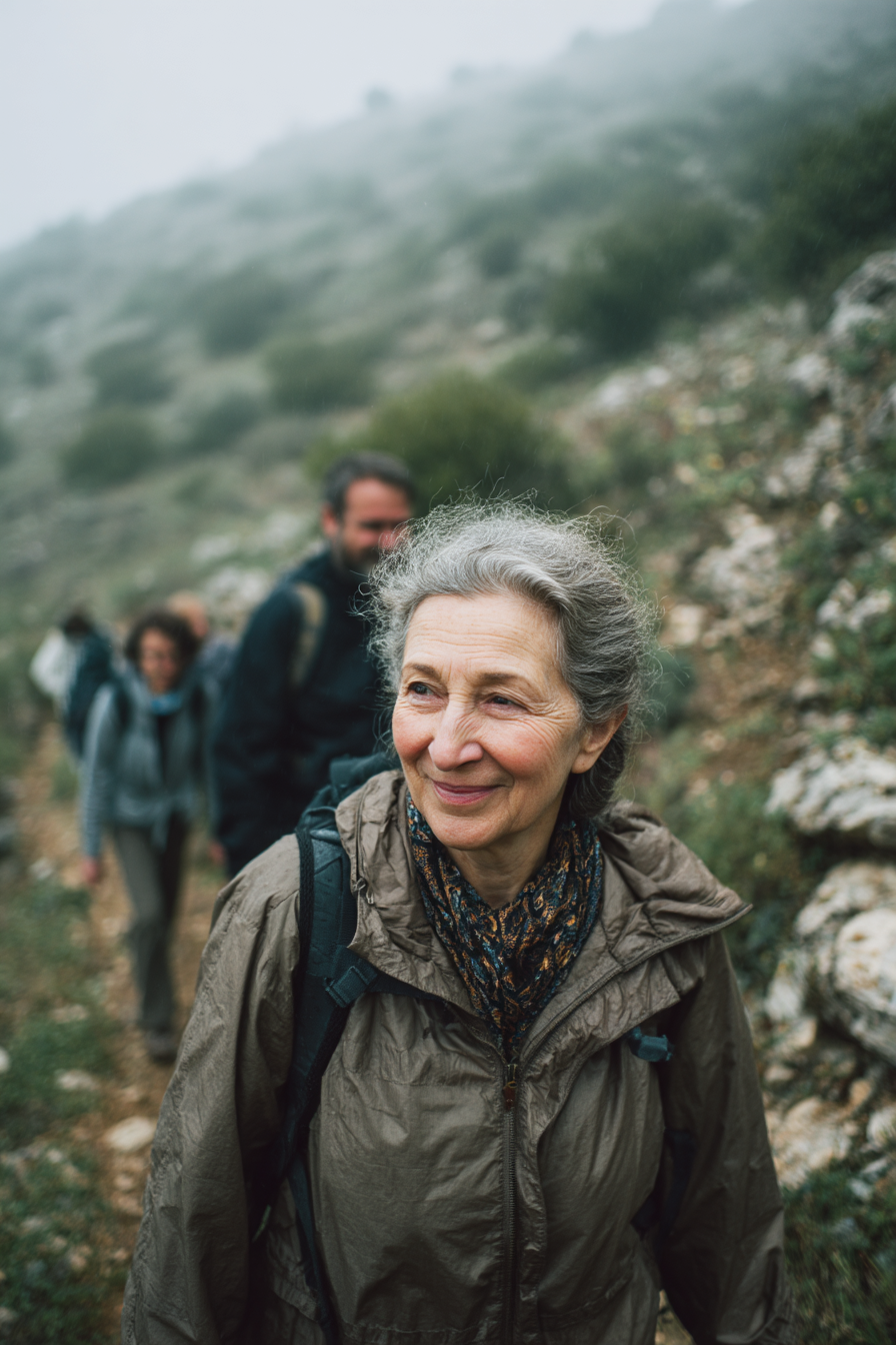 La imagen muestra a una mujer mayor con cabello canoso que sonríe en un entorno natural, aparentemente durante una caminata o excursión. Ella está vestida con una chaqueta marrón y un pañuelo, lo que sugiere que se encuentra en un clima fresco o brumoso. A lo largo del sendero, hay otras dos personas detrás de ella, una de ellas claramente visible, mostrando que forman parte de un grupo. El entorno es montañoso, con vegetación baja y rocas, y hay una ligera neblina que otorga un aire de misterio al paisaje. La expresión de la mujer refleja alegría y satisfacción, lo que sugiere que disfruta de la actividad al aire libre y de la compañía de sus compañeros.