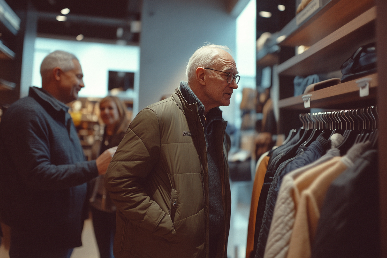 La imagen muestra a un hombre mayor con gafas, mirando atentamente una selección de chaquetas en un estante de una tienda de ropa. Lleva una chaqueta acolchada verde que contrasta con los colores más oscuros de las prendas. A su lado, hay un hombre más joven con cabello gris en un tono oscuro, que parece interactuar con una mujer detrás de ellos. Esta mujer, con una sonrisa, se encuentra en el fondo y está parcialmente oculta detrás del estante. La tienda tiene un ambiente acogedor y moderno, con luces suaves y estanterías bien organizadas, exhibiendo diversas prendas de vestir. La escena sugiere un momento de socialización y compra, destacando la interacción entre las personas en un ambiente comercial.