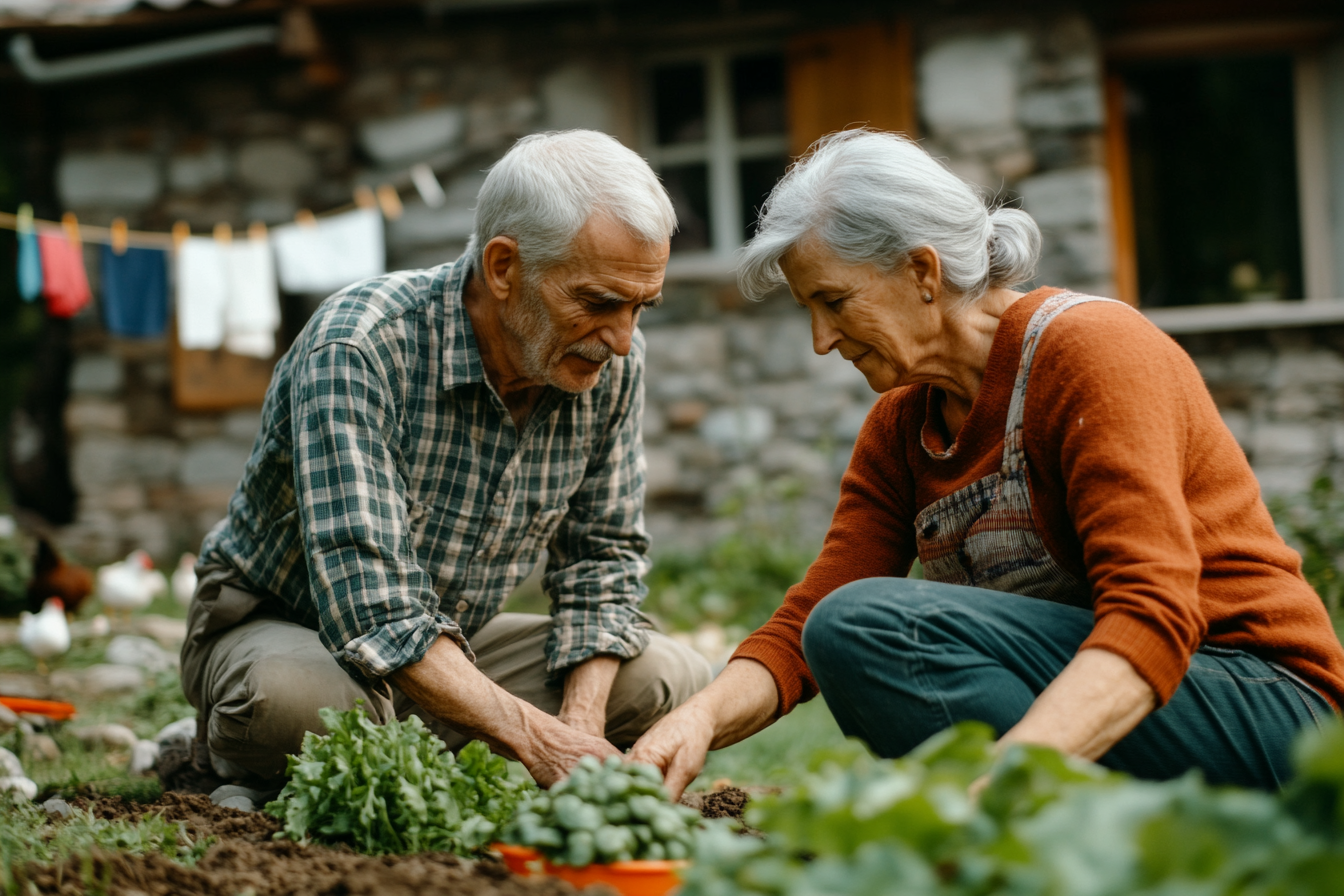 La imagen presenta a una pareja de personas mayores trabajando en un jardín, metidos en la tierra y cultivando vegetales. Ambos están agachados en una zona verde, rodeados de plantas y lechugas. El hombre lleva una camisa de cuadros y se muestra concentrado en su tarea, mientras que la mujer, con cabello canoso atado en una coleta, viste un suéter de color naranja y un overol. Detrás de ellos se puede ver una pared de piedra que sugiere un ambiente rústico, junto a una línea de ropa colgada que añade un toque hogareño. La luz natural ilumina la escena, creando una atmósfera tranquila y acogedora. En el fondo, hay algunos detalles como gallinas que refuerzan el ambiente rural y de conexión con la naturaleza.