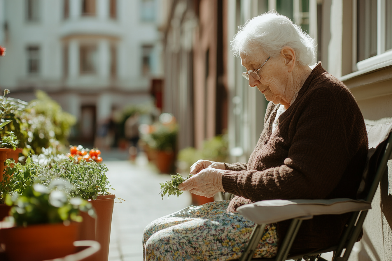 La imagen muestra a una anciana sentada en una silla plegable, en un patio o pasillo tranquilamente iluminado por la luz del sol. Lleva un suéter marrón y un vestido con estampado floral. Su cabello es blanco y está recogido. Ella sostiene cuidadosamente unas hierbas en sus manos, mostrando atención y dedicación en su tarea. Al fondo, se pueden ver macetas con plantas verdes y florecitas de varios colores, así como algunas tomatitos rojos, sugiriendo un ambiente de jardinería. Las paredes del edificio que la rodean son de tonos claros y hay una sensación de calma y serenidad en el lugar. Algunas personas son visibles a la distancia, pero no distraen la atención del foco principal: la mujer experimentando un momento de conexión con la naturaleza.