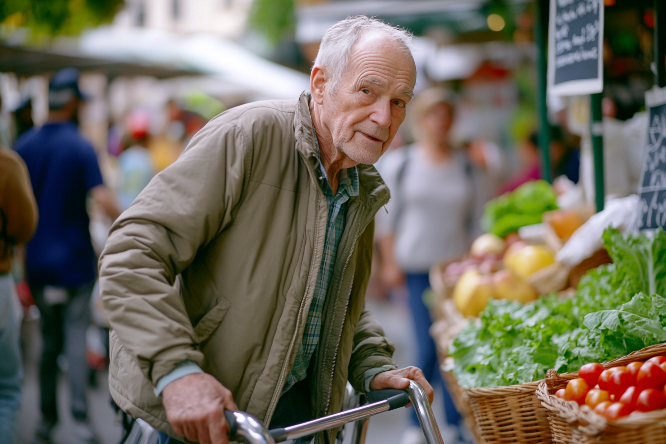 La imagen muestra a un hombre mayor en un mercado al aire libre, donde se venden frutas y verduras frescas. El hombre, que usa un abrigo claro y una camisa de cuadros, se apoya en un andador mientras observa los productos a su alrededor. Su expresión es amigable y curiosa. Detrás de él, se pueden ver otros compradores que interactúan con vendedores y examinan lo que hay en las mesas, creando un ambiente dinámico y bullicioso. Las cestas de frutas y verduras están bien organizadas, con una variedad de colores que atraen la atención, incluyendo lechugas verdes, tomates rojos y frutas de varias formas. La luz del día proporciona una atmósfera cálida, destacando los detalles de la escena cotidiana en el mercado.