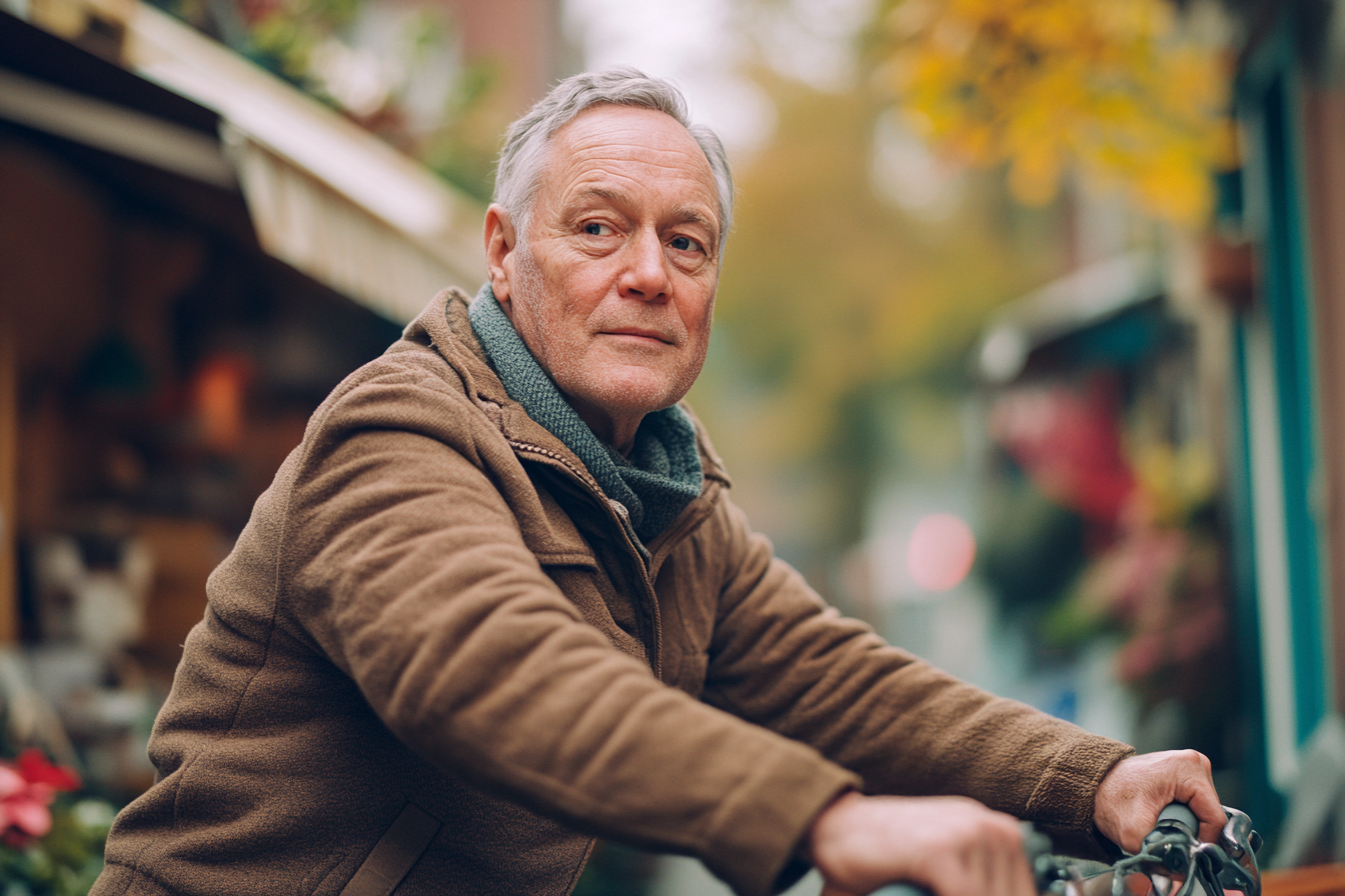 La imagen muestra a un hombre mayor sentado sobre una bicicleta, luciendo pensativo y contemplativo. Tiene el cabello canoso y un rostro que refleja sabiduría y experiencia. Viste una chaqueta marrón de textura suave y un cuello de suéter azul que contrasta con la chaqueta. El fondo presenta una atmósfera otoñal con tonos cálidos, donde se pueden distinguir hojas amarillas y detalles borrosos que sugieren un entorno urbano, posiblemente un mercado o una calle pintoresca. La luz es suave y difusa, creando un ambiente acogedor y nostálgico. La mirada del hombre se dirige hacia un punto fuera de campo, lo que invita a la reflexión y a la imaginación sobre sus pensamientos.