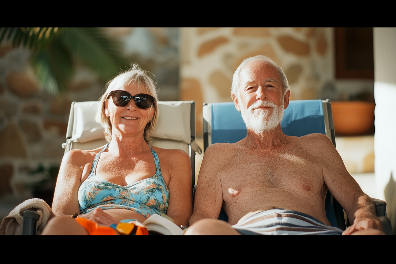 La imagen muestra a una pareja de adultos mayores disfrutando de un día soleado en un entorno relajante. Ambos están sentados en tumbonas, con sonrisas amplias que reflejan su satisfacción y felicidad. La mujer, de cabello corto y rubio, lleva un bikini colorido y gafas de sol oscuras, mientras que el hombre, con cabello gris y barba, está sin camiseta, mostrando su piel tostada por el sol. Al fondo, se puede apreciar un ambiente tropical con paredes de piedra y plantas verdes que añaden un toque natural al escenario. El enfoque de la foto resalta la serenidad y la alegría de la vida al aire libre, lo que sugiere un momento de descanso y disfrute.
