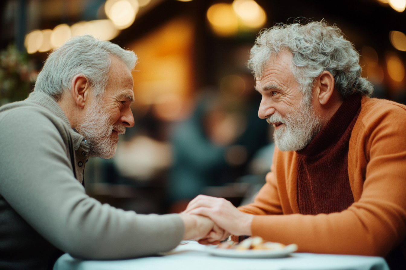 La imagen muestra a dos hombres mayores sentados en una mesa, disfrutando de un momento de conexión y complicidad. Ambos tienen cabello canoso y barbas, y se ven felices mientras se miran a los ojos y se sostienen las manos. Uno de ellos lleva un suéter gris claro, mientras que el otro está vestido con un suéter de color terracota. El entorno es acogedor, con un fondo desenfocado que sugiere un ambiente de café o restaurante. Las luces suaves en el fondo añaden un aire cálido a la escena, enfatizando el diálogo íntimo entre ellos. La expresión en sus rostros refleja alegría y afecto, indicando una profunda amistad o una relación sentimental.