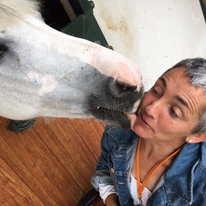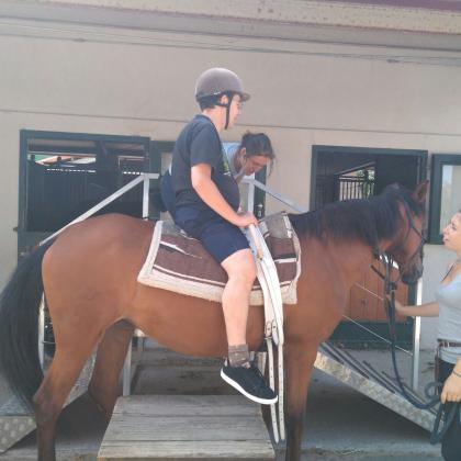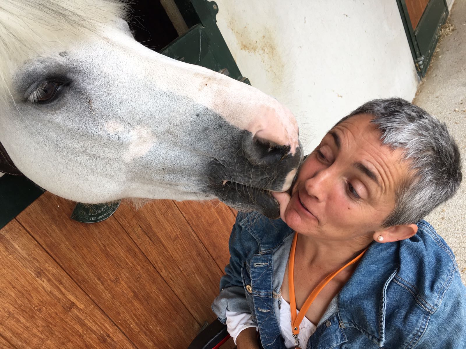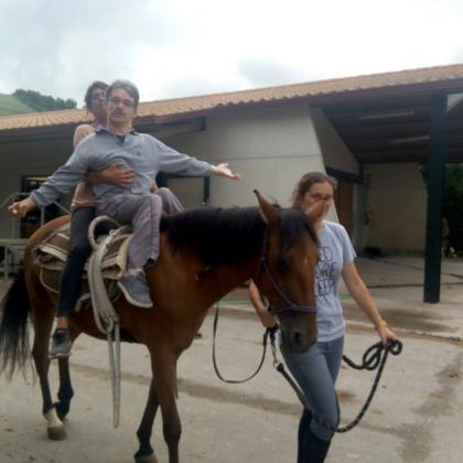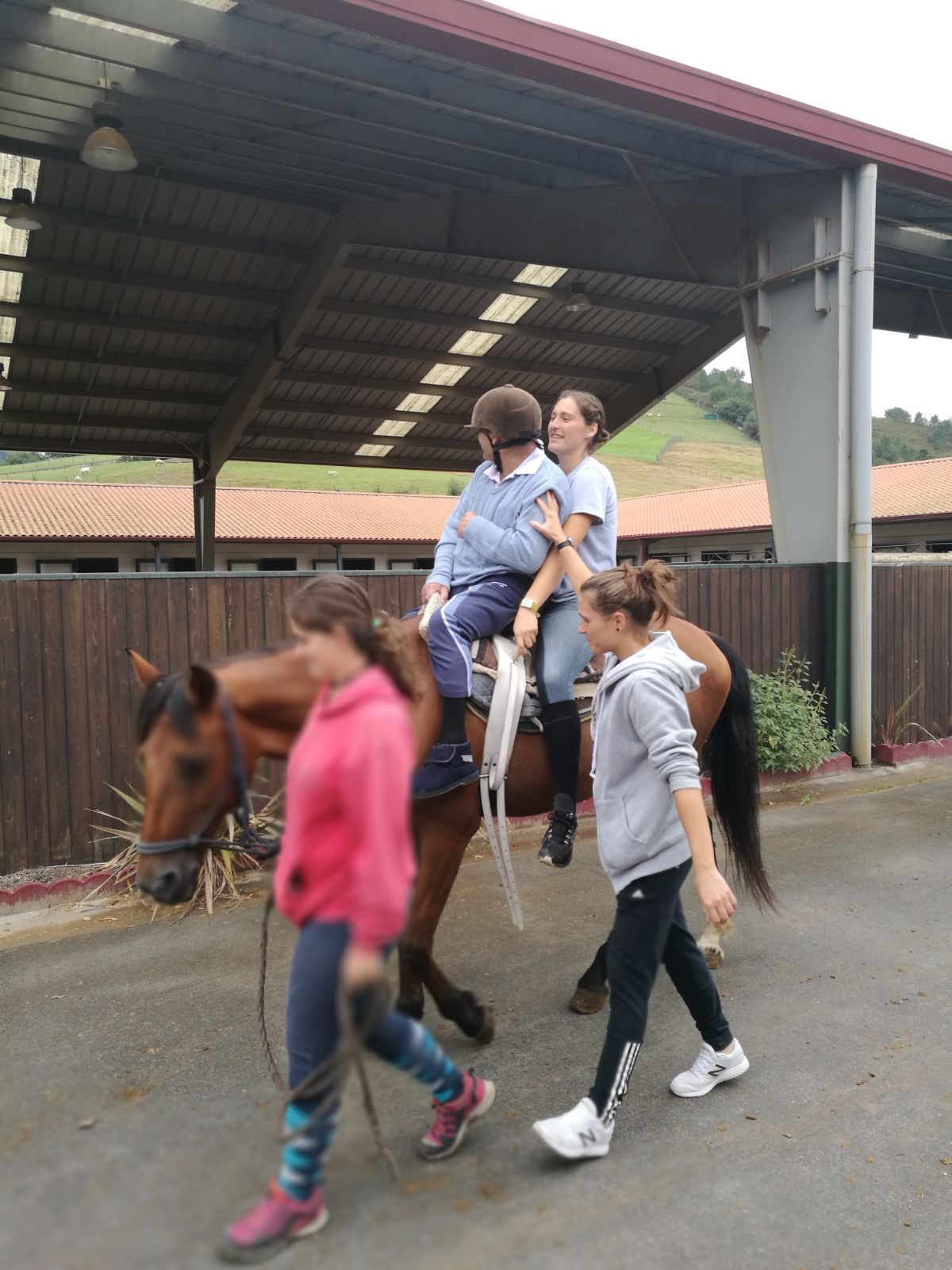 La primera salida la hicimos el 18 de julio y, desde entonces, cada martes un grupo de personas residentes de IZA va en taxi adaptado a la hípica Miracampos en Lasarte. Todos los participantes son acompañados por un grupo de trabajadores donde, a turnos, montan en una yegua preparada para este tipo de programas.