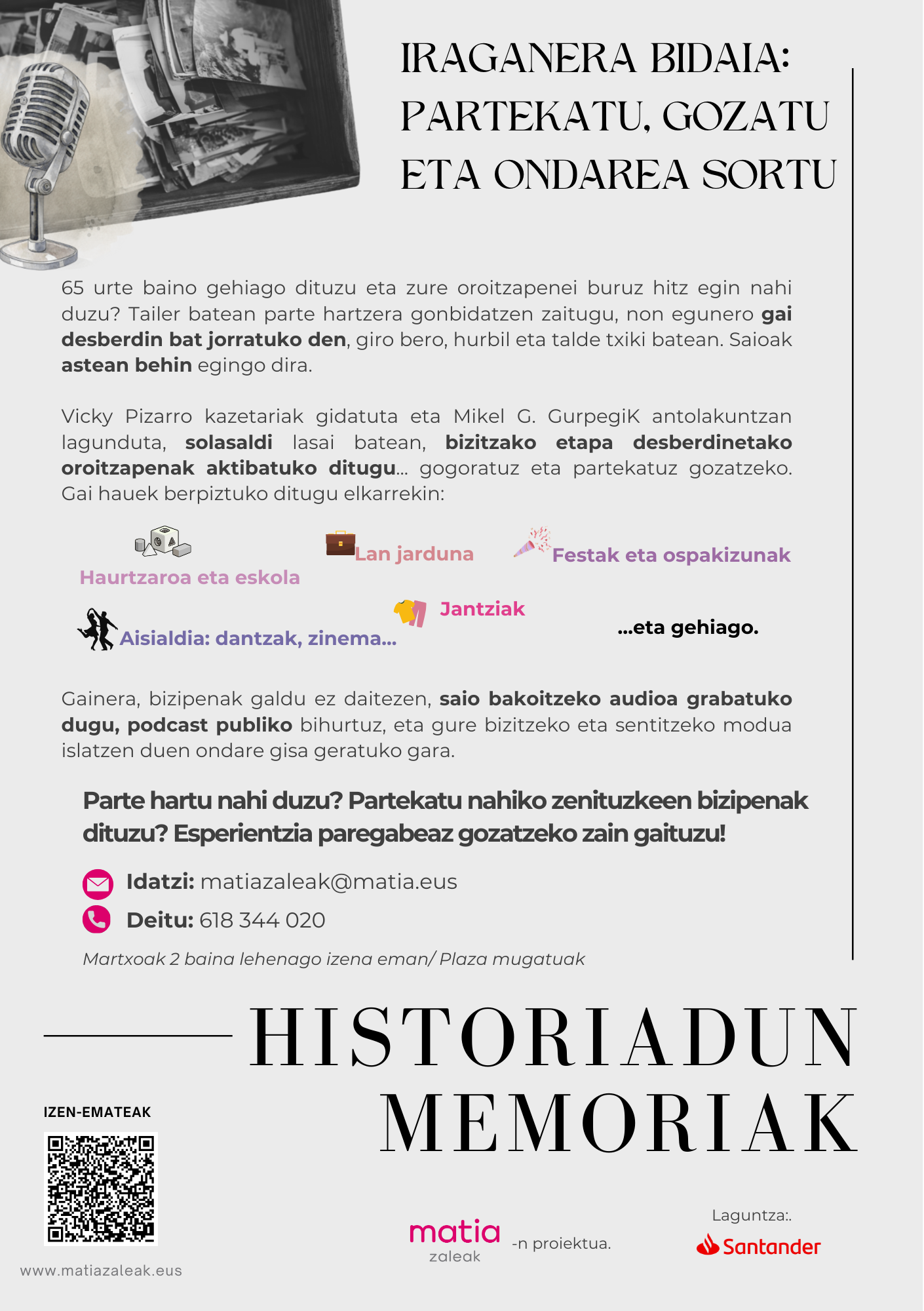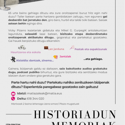Aldaketa demografiko eta sozialek urrundu egiten dituzte belaunaldiak, eta askotan blokeatu egiten dute transferentzia hori eta ezagutzeko interes hori. Hori dela eta, podcast tematikoak grabatuko ditugu, eta hor bigarren zatia etorriko da, zabalkundearena eta hortik erator daitezkeen jarduerena, informazio eta oroitzapen horiek pertsona gehiagorengana, belaunaldi gehiagorengana eta denboran iraungo dutenengana irits daitezen.