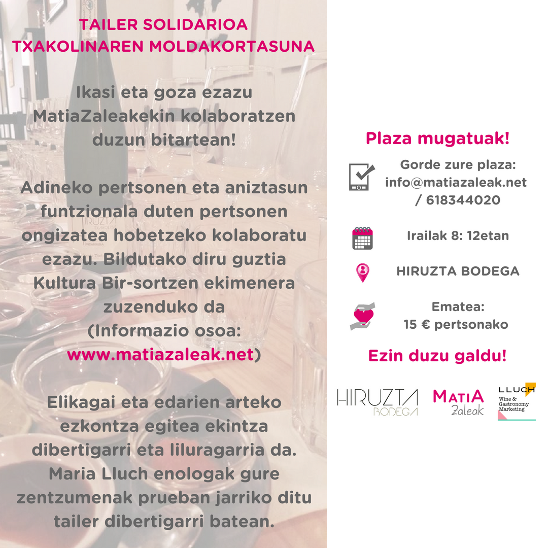 TAILER SOLIDARIOA - TXAKOLINAREN MOLDAKORTASUNA: Lluch Wine & Gastronomy eta Hiruztari esker, gaur, Irailaren 8a, tailer solidario bat egin dugu, non disfrutatu eta ikasi egin dugun txakolinaren moldakortasunaren inguruan. Hiruztan etxean bezala egon gara, upategira bisita eta historiaren errepasoa egina. ETa MAria Lluchen eskutik disfrutatu eta barre egin dugu, eta noski, ikasi. Partehartzaile guztiei esker... 26... 405 € bildu ditugu... beraz.... LORTUTA!!!!!!