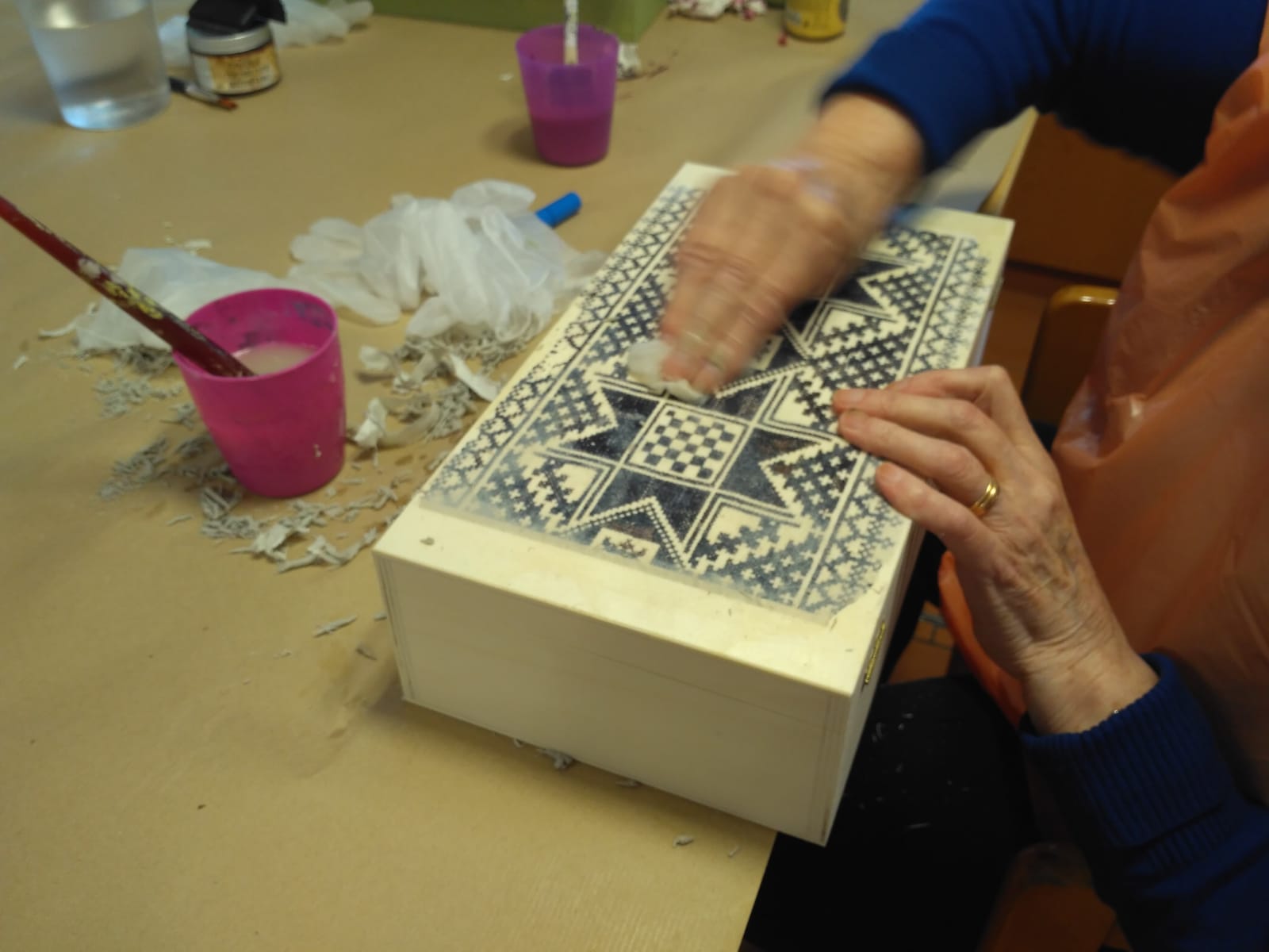 Teknika ezberdinak erabiltzen, partehartzaile bakoitzak bere kaja pertsonala dekoratu du. 10 emakumek partehartu dute eta askok euskal arreoa dekoratzen zen brodatuekin.