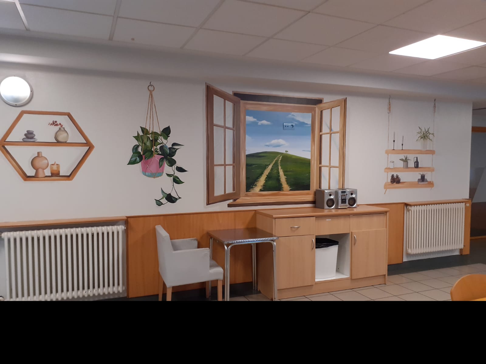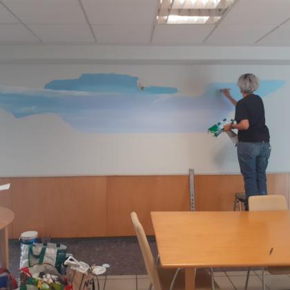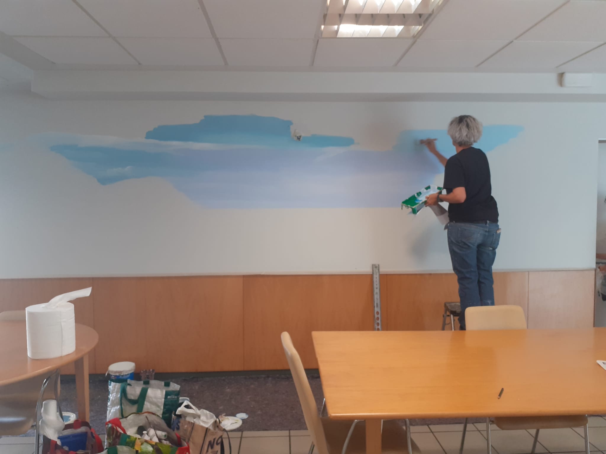 Eva Menaren laguntza izan dugu. Berak zuzenean egin ditu pinturak horman, leihoak irekiz eta dekorazio-elementuak gehituz, baina arriskurik gabe.