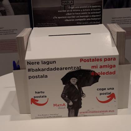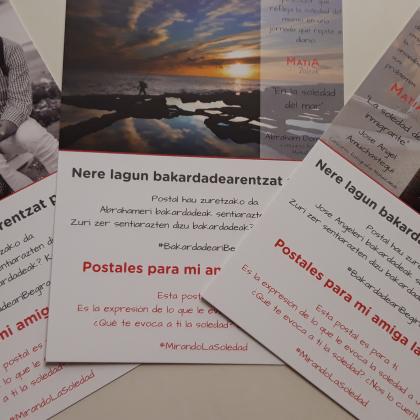 Elkarte kolaboratzaileei esker, Gipuzkoa guztitik postalen banaketa doainekoa egiten ari gara. Postal hauek bi zatitan banaturik daude: goiko aldean argakiza eta ez deseatutako bakardeari aurre egiten dioten kolaboratzaileen logoak azaltzen dira. Eta behekaldean mezu bat idazteko tokia dute. Bakardadearen inguruan sentitzen dugunaren hausnarketa bat izan daiteke, bakarrik sentitzen den norbaitentzako mezu bat, elkarbanatu nahiko genukeen mezu bat, bakardadearekin bizitzeko ikaskuntza bat... Argazkian inspiratu gaitezke, edo aurkitzen garen momentuan, edo gai honekiko gizarteari opa dioguna.