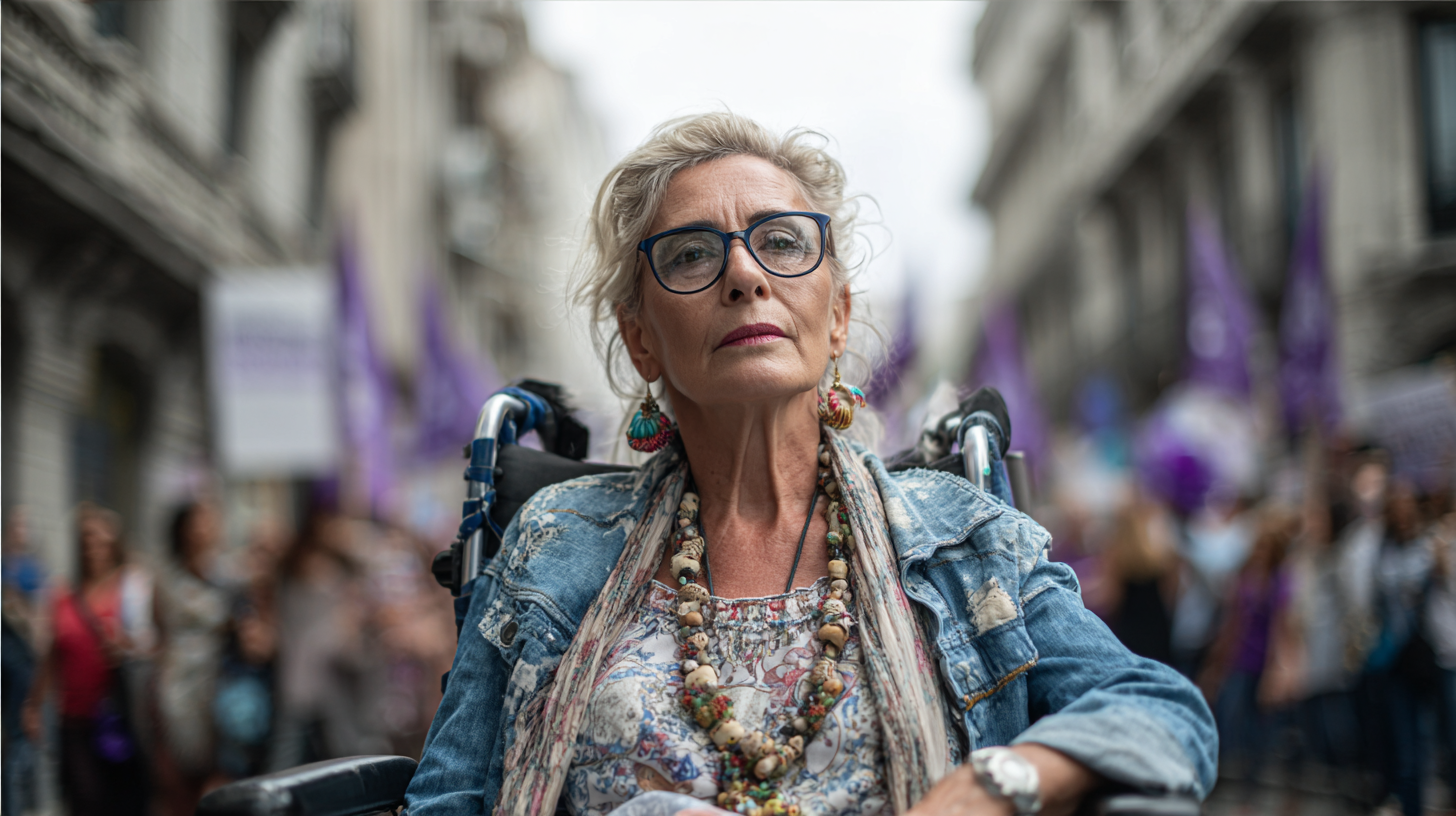 Irudiak ile horiak dituen emakume bat erakusten du, espressione serio eta erabaki batekin, oihal errebatu batean eseri. Ilekak ditu eta estilo berezi bat du, denim jaka eta kolar koloretsuak barne. Bere jantziak modernitate eta bohemia nahasten ditu. Atzeko planoan, manifestazio batean parte hartzen ari diren hainbat pertsona ikus daitezke, bandera eta pankarta batzuekin, protesta edo zeregin sozial bati babesa ematen ari den ingurua irudikatuz. Eskena hiri batean garatzen da, eraikin altuak eta hormetan arkitekturako xehetasunak ikusten dira. Argia apur bat da eta zerua lainotsua ematen du, irudiari tonu pentsamenduzko bat gehituz.