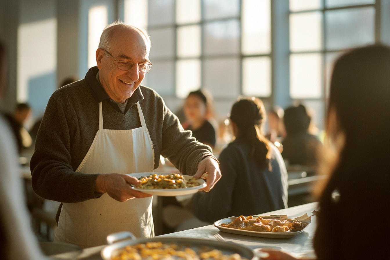 Irudiak irribarre beroa duen gizon zahar bat erakusten du jantoki batean janaria zerbitzatzen. Jertse iluna eta mantal zuria daramatza, sukalde edo jangela batean lanean ari dela iradokiz. Zerbitzu-ekintza honek lotura eta eskuzabaltasun une bat adierazten du. Atzean, mahaian eserita edo ilaran dauden pertsonak ikus daitezke, aurpegiak desenfokatuta. Leiho handietatik sartzen den argi naturalak giro epela eta hurbila sortzen du. Eszenak komunitatearen eta harreraren balioa azpimarratzen du, elikadura partekatuaren garrantzia nabarmenduz.