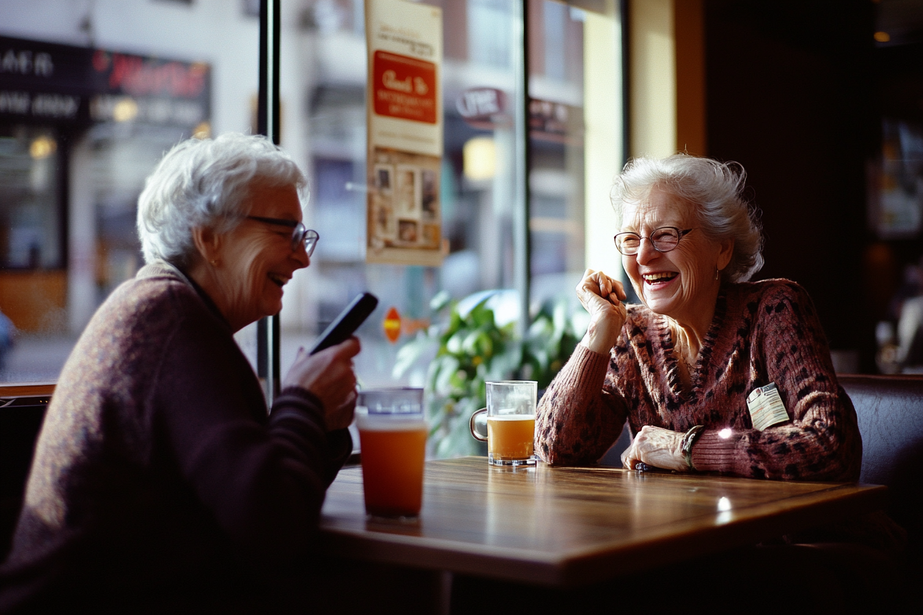 Irudiak bi emakume nagusi erakusten ditu kafetegi batean mahai baten inguruan eserita, irribarrez eta elkarrizketaz gozatzen. Ezkerrekoak mugikorra du eta barre egiten du. Eskuinekoak eskuarekin mahaia ukitzen du eta aurpegian poza ageri du. Mahaian bi edalontzi daude: bat garagardo edo laranja zukuz betea eta bestea ur gardenez. Atzean leiho handiak ikus daitezke eta haien atzean hiri-ingurunea, negozioak barne. Giro bero eta atsegina da, adiskidetasunaren eta konplizitatearen indarra nabarmenduz.