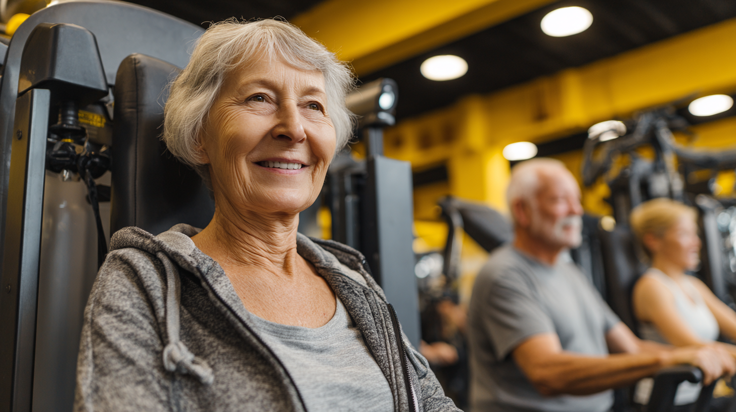 Irudian, gimnasio batean, astelehen emakume zahar bat ikusten da, ariketa makinetan eseri. Bere ilea motza eta zuria du, eta irudi alai eta lasai bat dauka, honek bere ingurunean ondo sentitzen duela esaten du. Alkandora eskasa eta jaka grisa darama, zeinak mugikortasuna eta funtzionalitatea adierazten du ariketa fisikoentzat. Bere atzean, beste bi pertsona zahar ikus daitezke, ile griseko gizona eta ile zuriakoa emakumea, ere makinetan ariketa egiten. Gimnasioaren ingurua dardaratsu argiak ditu suetan, eta hormak kolore hori bizikoak dira, espazioari energia eta bitalitate sentimendu bat ematen diola. Irudian, fitnesari eta ariketa fisikoari buruzko mezu positiboa helarazten da zaharren adinean.