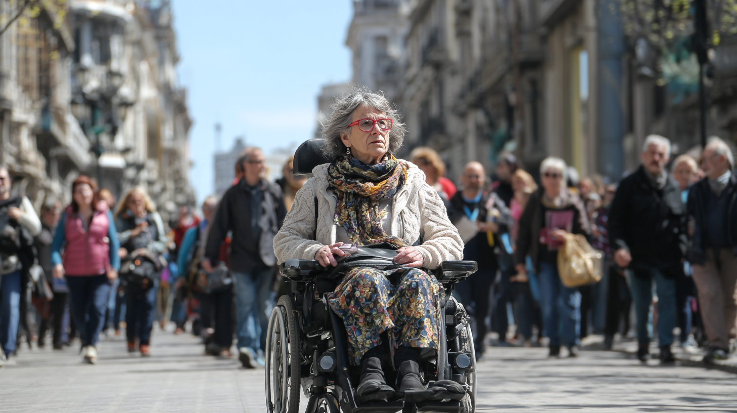 Irudiak kale giro bizi bateko eskaintza bat erakusten du, non emakume zaharr bat oihal argi batean eseri daiteke. Emakumeak abrigo argia eta panuelo koloretsua darama, eta kontemplatzailea ematen du inguruko pertsonen talde baten erdian. Ingurua bizia da, norbaiten multzoak norabide ezberdinetan ibiltzen da, batzuk aurrera begiratzen dute, bitartean beste batzuk elkarrizketa egiten dutela dirudi. Kalea inguratzen duen arkitektura hiriguneko ingurune baten ohikoak dira, zenbait solairuko eraikinak eta ikus daitezkeen arkitektura xehetasunak. Eguzkiaren argia ilumina eszena, eguraldi atsegina irudikatuz. Emakumeak, mugitzen ari diren beste pertsonen aldean, geldialdi batean dagoela dirudi, hau da, bere lasaitasunaren eta biziko multzoaren energia arteko kontrastea sortzen du.