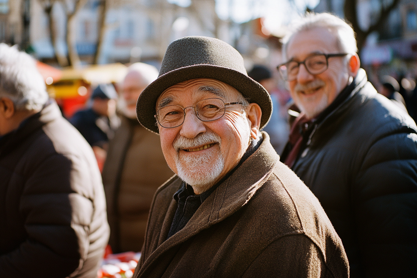 Irudiak gizon nagusi bat erakusten du irribarre zabalez, abrigo marroiarekin eta txapel gris argiarekin. Bizar mehe eta urdindua du eta irribarre atsegina osatzen du. Betaurreko biribilak daramatza eta bere aurpegiko adierazpenak beroa eta gertutasuna iradokitzen du. Atzean beste gizon batzuk eta merkatu giro koloretsua ikus daitezke. Eskuin aldean beste gizon bat ere irribarretsu dago, une zoriontsua partekatzen dutela adieraziz. Eguzki-argiak eszena berotzen du.