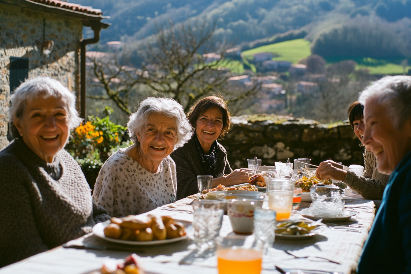 emakume nagusiak, aire libreko bazkaria, familia bilera, natura, irribarreak, landa paisaia, adiskidetasuna, eguzki-argia, apaindutako mahaia, une zoriontsuak