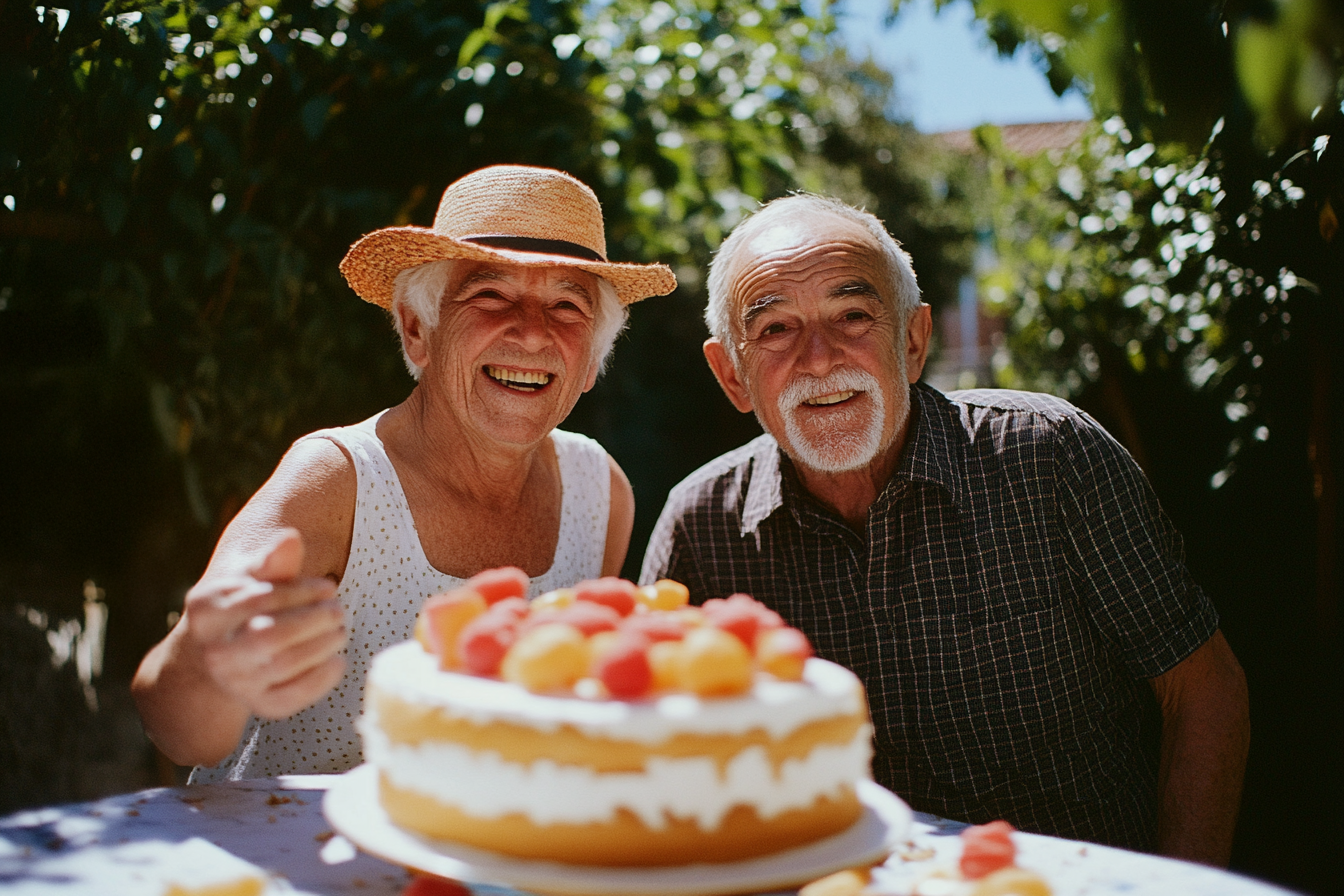 Irudiak bikote nagusi bat erakusten du pozik irribarrez, aire librean fruta apainduriko tarta baten aurrean jarrera hartuta. Biak alai eta lasai daude, ospakizun une bat erakutsiz. Emakumeak lastozko txano bat eta mahuka gabeko blusa bat daramatza, eta eskuarekin keinu alaia egiten ari da. Gizonak, bizar zuriarekin eta laukidun kamiseta batekin, uneaz gozatuz ageri da. Atzean hosto berdeak eta natura paisaia ikus daitezke, familia bilera bero eta atsegina iradokiz. Tartak marrubiak eta bestelako fruituak ditu, konposizioari kolore eta erakargarritasun ukitua emanez.