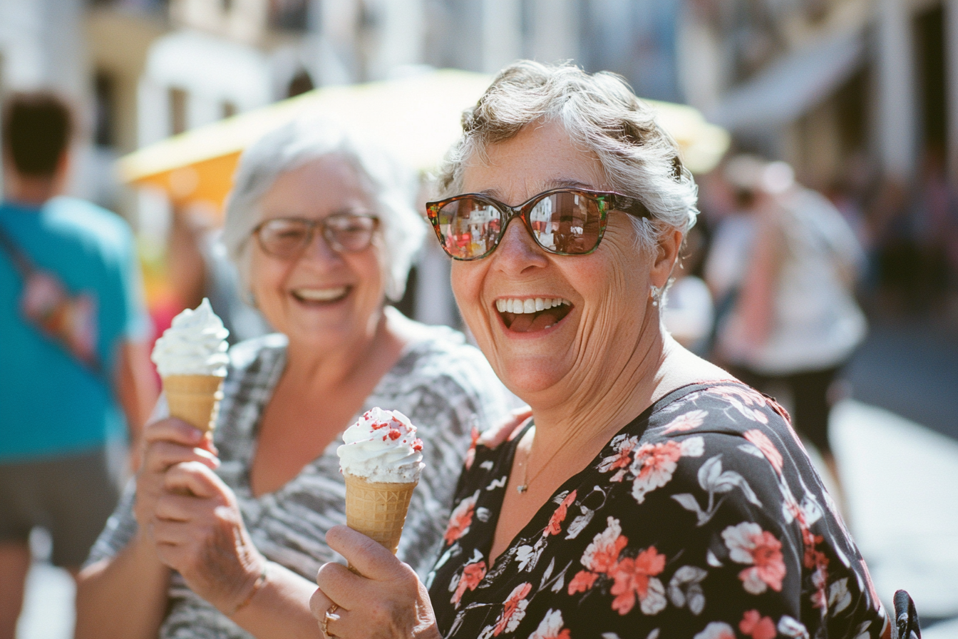 Irudiak aire libreko giroan une alaia bizitzen ari diren bi emakume nagusi erakusten ditu. Eskuan izozki-konoak dituzte eta barrez ari dira, zoriontasun eta adiskidetasun giroa sortuz. Emakumeetako batek ile urdindua eta eguzkitako betaurreko ilunak daramatza; besteak ere betaurrekoak ditu, baina estilo desberdinekoak. Arropa informal eta lore-estanpazkoa daramate, giro udatiar eta lasaia adieraziz. Atzean beste pertsona batzuk eta aterki horia bat ikus daitezke, leku jendetsua dela iradokiz, agian azoka edo jaialdi bat. Eguzkiak eszena argitzen du, giro alaia eta bizi bat sortuz.