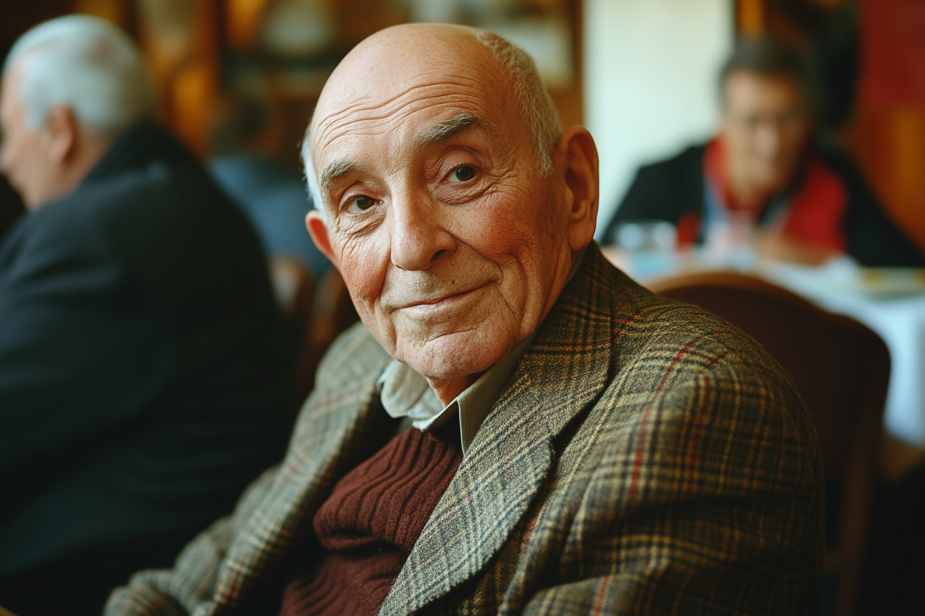 Irudiak adineko gizon bat erakusten du, adierazpen atsegin eta lasaiarekin. Bere aurpegia zimurrez betea dago eta horrek bizitzako esperientzia iradokitzen du. Jaka laukiduna eta jertse iluna daramatza, eta horrek itxura bero eta lasai bat ematen dio. Argiztapen leunak bere larruazalaren eta arropen testurak azpimarratzen ditu. Atzean, beste pertsona batzuk ikus daitezke, jatetxe edo kafetegi giro batean daudela dirudiena. Dekorazioaren beroak eta inguruko elementuek giro atsegina sortzen dute. Bere begirada sakona da, iraganeko momentuak edo elkarrizketa goxoa gogora ekartzen ari dela dirudi.