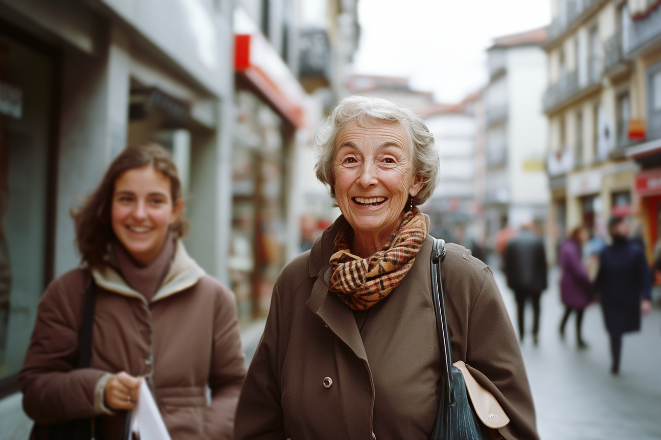 Irudiak emakume nagusi bat erakusten du irribarre zabalez, zoriontasuna eta poza adieraziz. Abrigo marroi bat eta marradun zapi bat daramatza, dotorezia ukitua emanez. Alboan neska gazte irribarretsu bat dago, harreman estua iradokiz, baliteke adiskidetasun edo familiarteko lotura izatea. Atzealdean, kolore askotako eraikinak eta jendea ibiltzen ari den kale bat ikus daitezke, giro hiri bizi bat adieraziz. Argi leuna eta zeru lainotsua dira, koloreak leundu eta giro epela sortzen dutenak. Eszenak berotasuna, belaunaldien arteko lotura eta une alai bat transmititzen du.