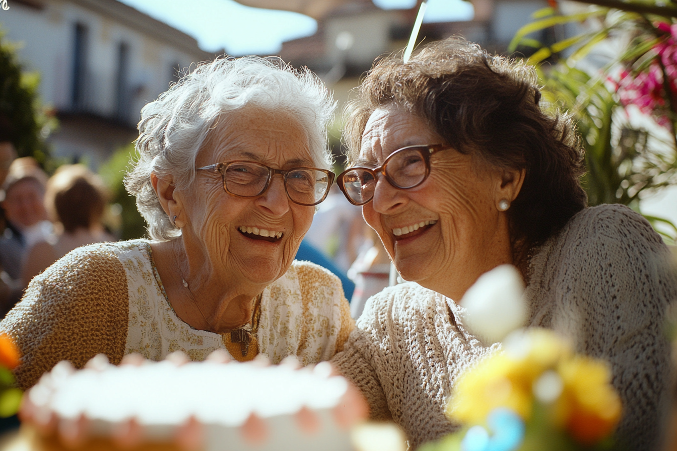 Irudiak irribarretsu dauden bi emakume nagusi erakusten ditu, giro festibo eta alai batean mahai berean eserita. Ile urdinduna dute eta betaurrekoak jantzita daramatzate. Ezkerreko emakumeak jertse argia darama eta aurpegian poz adierazten du; eskuinekoak jertse lodiago bat eta belarritako bat daramatza. Aurrean, esnegain eta apaingarriz hornitutako tarta bat ikus daiteke, urtebetetze edo ospakizun berezi bat iradokiz. Atzealdea apur bat desenfokatuta dago, baina pertsonak eta kolore biziko giroa ikus daitezke, ospakizun giroa indartuz. Argiztapen bero eta naturala da, eszenari goxotasuna ematen diona.