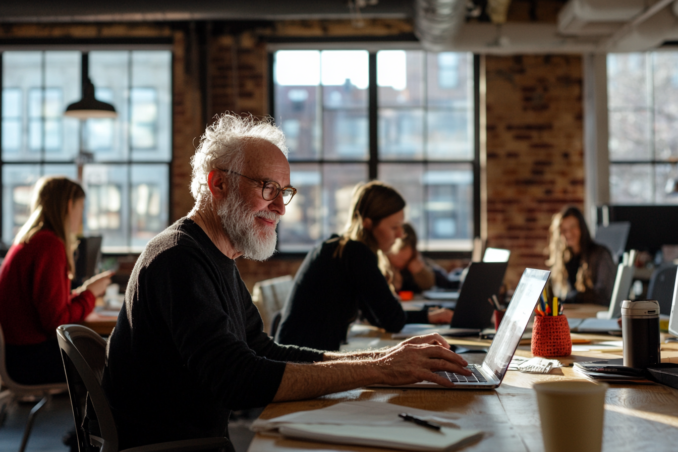Irudiak lan-giro moderno eta dinamiko bat erakusten du, lankidetzan oinarritua. Lehen planoan, bizar zuri eta betaurrekodun gizon nagusi bat irribarretsu ageri da, ordenagailu eramangarri batean lanean. Jertse beltza darama eta egur koloreko mahai batean eserita dago, bulegoko objektu batzuk ditu inguruan. Atzean, emakume gazteak ageri dira, batzuk ordenagailuekin lanean eta beste bat telefonoari begira. Leiho handietatik sartzen den argi naturalak giro beroa ematen dio espazioari eta adreiluzko pareten testura azpimarratzen du. Eszenak coworking gune bat dirudi, sormena eta produktibitatea sustatzeko diseinatua.