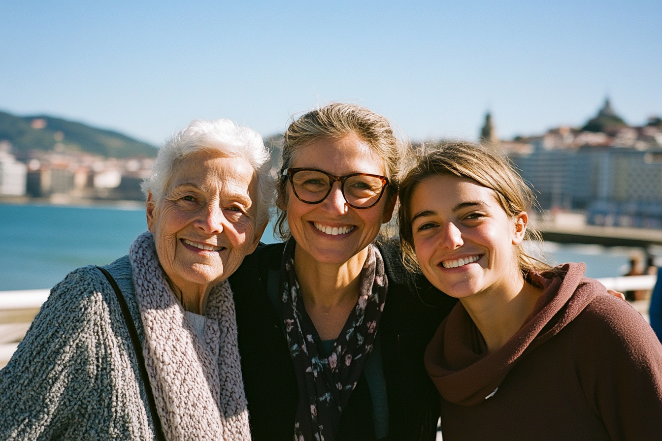 Irudiak hiru emakume erakusten ditu itsasertzeko paisaia baten aurrean jarrera hartuta, eguzkitsu den egun batean. Erdian, adin ertaineko emakume bat ageri da irribarre zabalarekin, betaurrekoekin eta tonu iluneko jantziarekin, lepoan zapi batekin. Ezkerrean, ile zuridun emakume nagusi bat dago irribarretsu, jertse gris argi batekin. Eskuman, ile kastain ilun samarreko emakume gazte bat dago, jertse marroi batekin eta irribarre handia du. Atzean, itsasoa eta eraikinak dituen hiria ikus daitezke, kostaldeko ingurunea iradokiz. Eguzki-argiak aurpegiak argitzen ditu eta giro bero eta alai bat sortzen du.