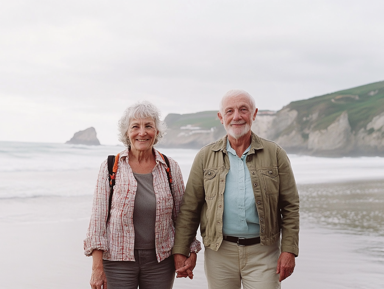 Irudiak bikote nagusi bat erakusten du hondartzan, elkarri eskutik helduta eta irribarretsu. Emakumeak ile kizkur eta grisarekin, laukidun kamiseta eta gris koloreko elastikoa daramatza, praka ilunekin, eta motxila bat bizkarrean. Gizonak ile eta bizar grisarekin, elastiko argi bat, jertse bat eta beroki berde bat daramatza. Atzean hondartza zabalduz doa olatu leunekin, eta paisaia berdez betetako muinoak ikus daitezke. Zerua lainotsua da, giro lasaia eta freskoa iradokiz. Bikoteak zoriontasuna eta konplizitatea islatzen ditu, une intimo eta esanguratsu bat bizitzen duten bitartean.
