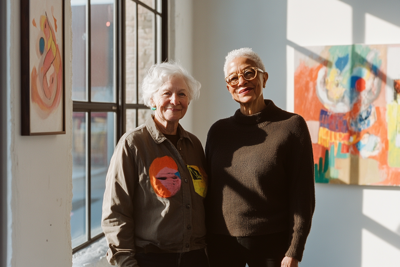 Irudian, bi emakume ikus daitezke zutik, argi naturalak argiztatutako espazio batean, leiho handien bidez sartzen den argia dela eta. Ezkerrean, tonu epel eta leunetako pintura bat ikus daiteke. Ile zuriko emakumeak adierazpen alaia du eta bularrean koloretsua den diseinua duen jaka gris bat darama. Bere ondoan, ile labur eta griseko emakumeak jertse beltz bat eta marko argidun betaurrekoak daramatza. Ingurune artistiko batean daudela dirudi, atzean arte abstraktu eta koloretsuak ikus baitaitezke. Giroa goxoa eta sortzailea da, bi emakumeen arteko lotura eta inguruko artea iradokiz.