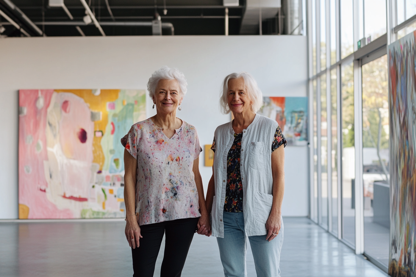 Irudiak bi emakume nagusi erakusten ditu galeria garaikide batean. Zutik daude, irribarretsu eta elkarri eskutik eutsiz, harreman estua eta maitasunezkoa adieraziz. Ezkerreko emakumeak tonu leuneko eta kolore orbanadun blusa bat darama; eskuinekoak lore-estanpadun kamiseta eta txalekoa. Atzean, arte abstraktuko hainbat lan ikus daitezke, kolore biziekin: arrosa, horia, berdea eta urdina. Argiztapen naturalak margolanen koloreak nabarmentzen ditu eta espazioa argitzen du, giro bero bat sortuz. Lurreko material arinak estilo moderno eta minimalista osatzen du.