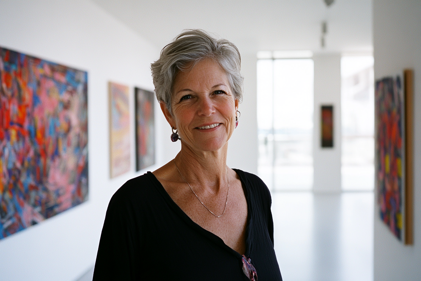 Irudiak ile labur eta urdindun emakume bat erakusten du, irribarre egiten ari dena argi naturalak betetzen duen barruko espazio batean. Alkandora beltz bat eta lepoko fin bat daramatza, bere azala nabarmentzen dutenak. Lehen planoan ageri da eta atzean arte modernoaren hainbat lan koloretsu ikus daitezke paretetan. Lan hauek abstraktuak eta koloretsuak dira, ingurune minimalistari eta garaikideari kontraste bizi bat ematen diotenak. Paretek kolore zurikoak dira eta zorua argi koloreko material batez egina dago, zabaltasun sentsazioa sortuz. Leiho handi batetik kanpoko paisaia bat antzematen da, argi naturala eta bizitasuna gehituz.