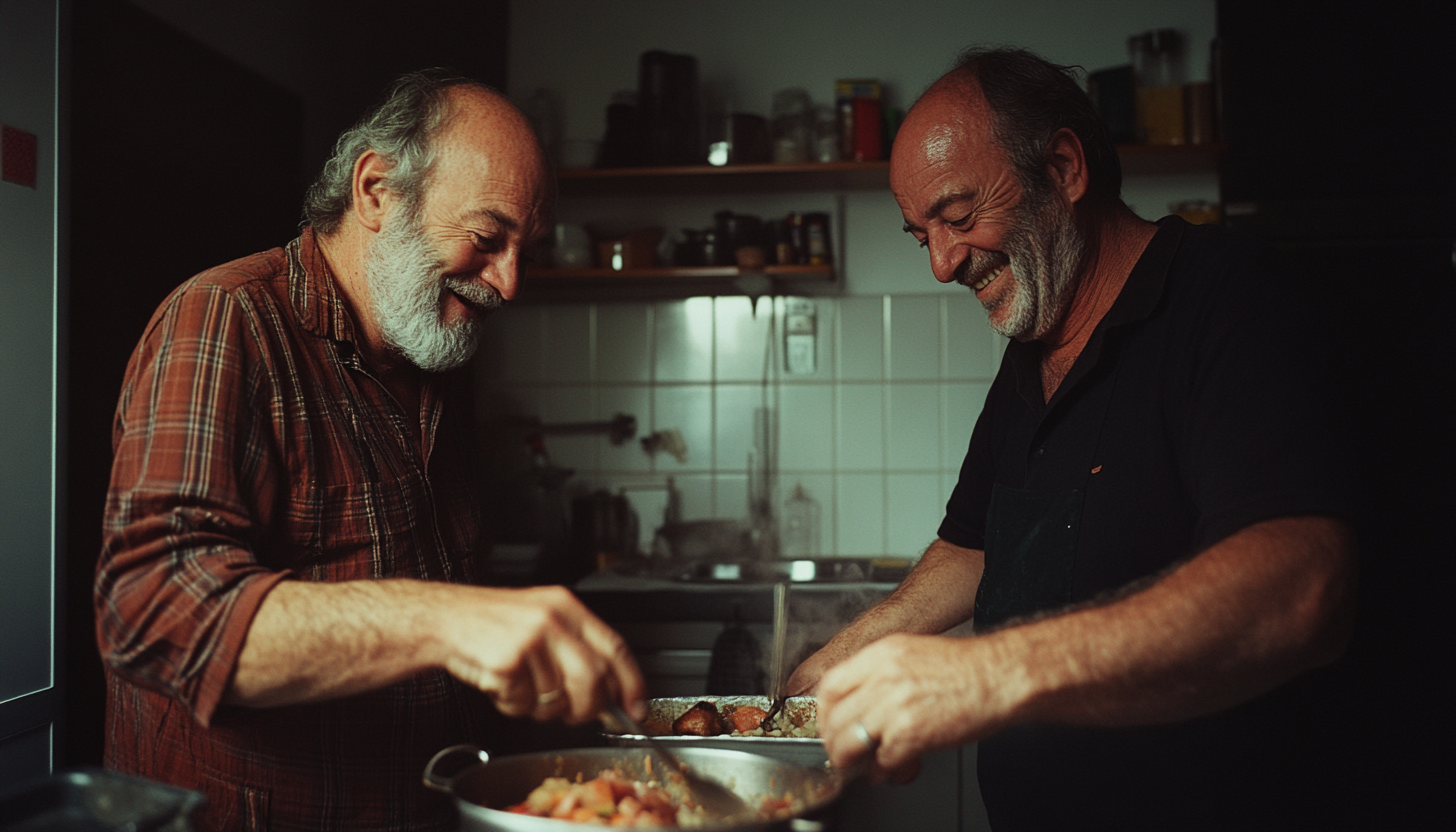 Irudiak bi gizon nagusi erakusten ditu sukalde batean, elkarrekin sukaldatzen pozik. Biek bizarra dute eta jarrera lasai eta atsegina. Batek laukidun alkandora darama eta besteak kamiseta beltza; biek irribarre egiten dute, giro lagunkoia eta beroa sortuz. Ontzi batean lurruna ateratzen da, janaria bero eta zerbitzatzeko prest dagoela iradokiz. Atzean sukaldeko tresnak eta espeziak dituzten apalategiak daude, etxeko giroa osatuz. Argiztapen leuna da, giro goxoa sortzen du eta gizon horien aurpegiek zoriontasuna eta konplizitatea adierazten dute.