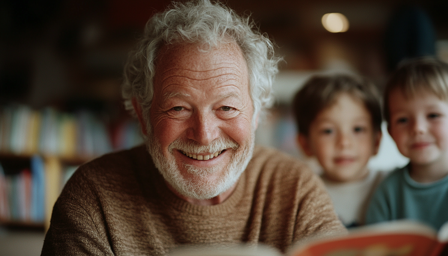 Irudiak ile kizkur eta urdindun gizon nagusi bat erakusten du irribarre zabalez, poza eta berotasuna adieraziz. Jertse marroi batek itxura goxoa ematen dio. Atzean, bi haur txiki ikus daitezke, aitonaren konpainiaz gozatuz. Haurrak begirada jakinmin eta alai batekin ageri dira; batek ile marroia eta kamiseta argia darama, eta besteak kamiseta urdin bat. Atzean, kolore anitzeko liburuz beteriko apalategiak daude, giro familiar eta aberasgarria iradokiz. Argiztapen leunak giro lasaia eta atsegina sortzen du, irakurketarako edo ipuin kontakizunerako aproposa.