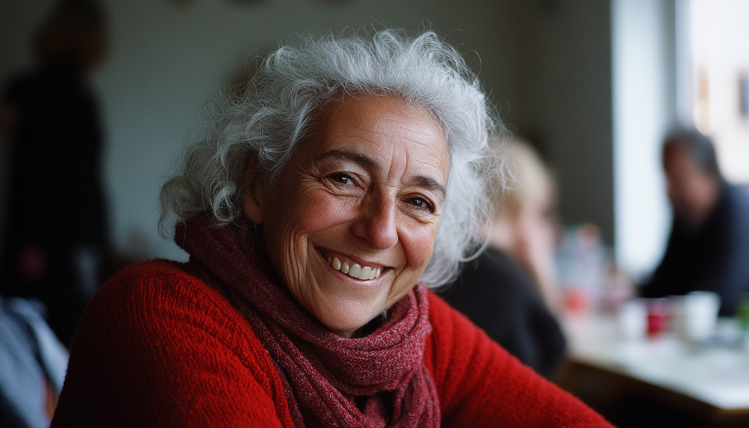 Irudiak irribarre goxoa duen emakume bat erakusten du, ile kizkur eta urdindunarekin. Jertse gorri bat eta aurpegia nabarmentzen duen bufanda bat daramatza. Argiztapen naturalak bere ezaugarriak azpimarratzen ditu eta giro leun eta atsegina sortzen du. Atzean, beste pertsonak lausotuta ikus daitezke, kafetegi edo familia-topaketa bateko giro sozialean daudela adieraziz. Emakumearen adierazpen pozak zoriontasuna eta berotasuna transmititzen du, ingurunearekin lotura positiboa adieraziz. Irudiak komunitate eta adiskidetasun zentzua islatzen du.