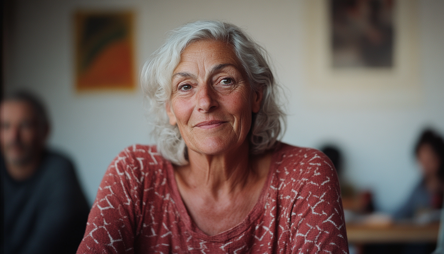 Irudiak kameraren aurrean eserita dagoen emakume nagusi bat erakusten du, aurpegian adierazpen atsegin eta lasaia duela. Bere ilea grisaxka da, kizkur eta soltean, itxura naturalean sakontzen duena. Kamiseta terrakota kolorekoa darama, diseinu argidun batekin, bere izaera beroa azpimarratzen duena. Atzean, beste pertsonak eta paretetan arte lanak ikus daitezke lausotuta, espazio sozial edo artistiko batean daudela iradokiz. Argiztapena leuna da eta eszenari giro lasaia eta atsegina ematen dio. Emakumeak irribarre arina du, konfiantza eta adeitasuna transmititzen ditu.