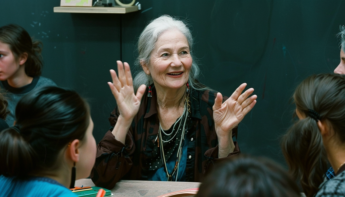 Irudiak ile gris argidun emakume bat erakusten du, hezkuntza-ingurune batean dagoela dirudi, agian ikasgela edo tailer batean. Zutik dago, bi eskuak mugituz hitz egiten ari dela dirudi, azalpen edo istorio bat kontatzen ari dela iradokiz. Bere aurpegiko adierazpena beroa eta atsegina da, ilusioa erakusten du. Alkandora ilun bat eta koloretsu osagarriak daramatza, itxura sortzaile eta artistikoa ematen diotenak. Inguruan gazte batzuk eserita daude, oso arretatsu eta emakumeari begira, ikasketa edo eztabaida batean parte hartzen ari direla adieraziz. Atzealdeko dekorazioa sinplea da, pareta ilun batekin emakumearen koloretsua kontrastean. Irudiak komunitate eta ezagutza partekatzearen zentzua iradokitzen du.