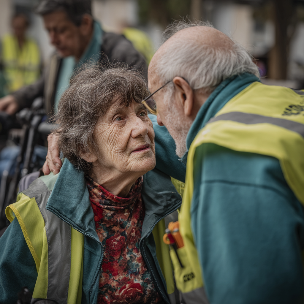 Irudiak emakume zaharr bat erakusten du, kabello kizkur eta zuriz, hurbil dagoen gizon zaharr bati arreta-zintzoa ematen. Biak ingurune bateko parte dira, atzeko pertsonak ikusten diren, komunitate-ekintzan murgilduta agertzen direnak, denak chaleko distiratsuez jantziak. Emakumearen aurpegia arreta eta beroa adierazten du, gizonak berriz hurbiltasun eta maitasunez hitz egiten ari dela dirudi. Eskena giza konexioaren unea islatzen du, hitz garrantzitsuak trukatzeko edo babesa adierazteko seinale izan daitekeena. Atzeko planoak hiriguneko ingurunea erakusten du, kanpoan ospatzen ari diren ekitaldian daudela esan nahi duena. Argia bigun eta beroa da, unearen atmosfera lagungarria eta ulergarria egiteko.