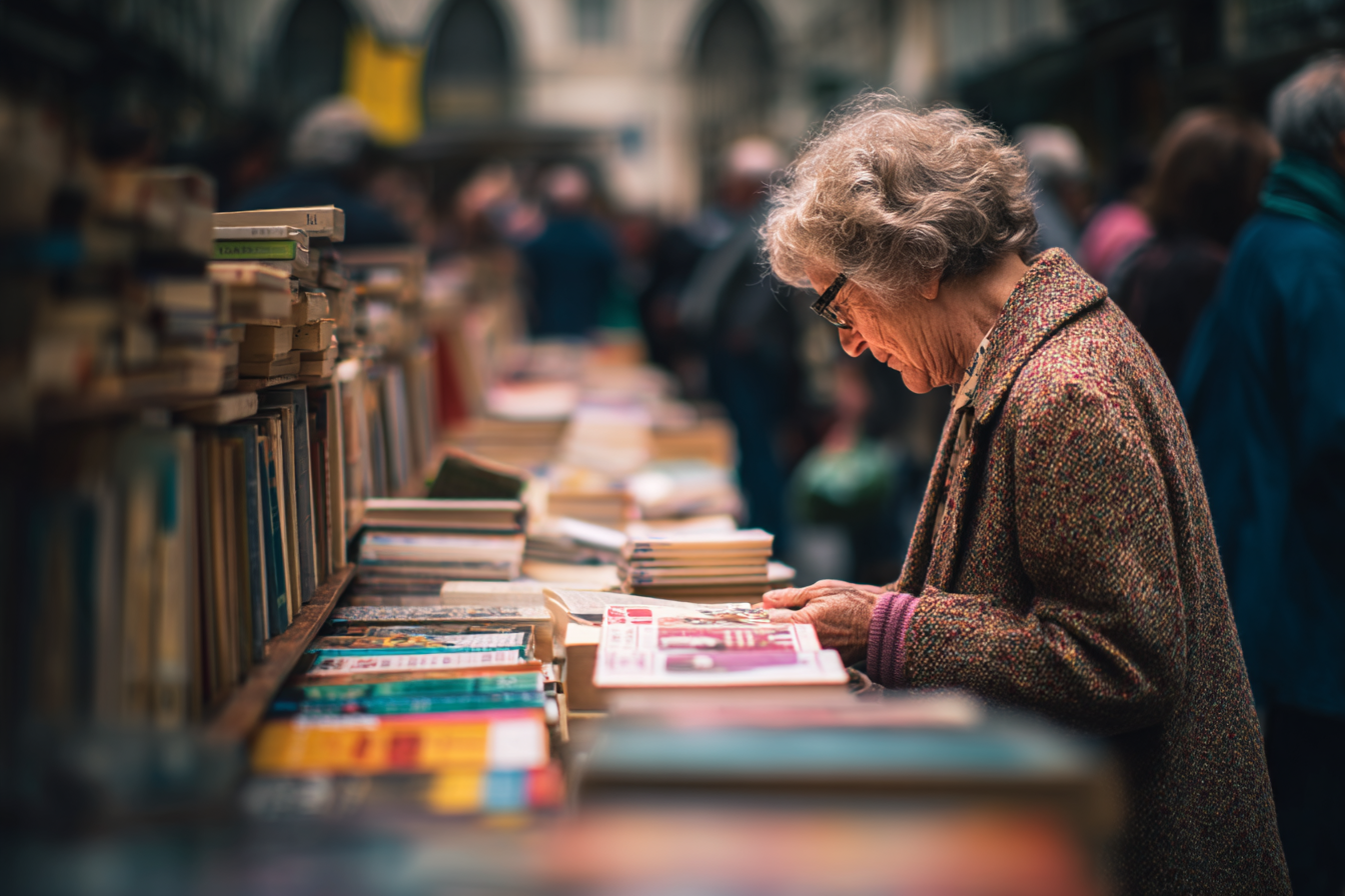 Irudiak liburu azokari biziki girotsua erakusten du, non emakume zaharrak liburu bat hautatzeko arreta jartzen duen zabal kolekzio batean. Tweed jaka darama, eta bere ile kizkur eta zilar kolorekoarekin kontrastatzen da. Mahaiak liburu ezberdinekoak eta kolore ezberdinekoak dituzte, batzuk apilatuak, besteak irekiak. Atzean, beste pertsonak ikus daitezke, azoka esploratzen ari direla dirudi, biziki eta bizi-zirraragarria sortuz. Eguzkiaren argia leun itzaltzen du eszena, harrigarria eta noski, irakurtzeko maitaleentzat ideal den giroa islatuz. Emakumeak, historia eta ezagutzaren itsasontzi batean, lasaitasun unea gozatzen ari dela dirudi.