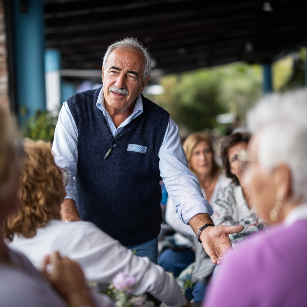 Irudiak adine erdikoa duen gizon bat erakusten du, ile zilar kolorekoarekin eta aurpegirik atseginarekin, chaleko ilun batean eta kamisa zurian jantzia. Zutik dago, posizio aktibo batean, esku bat zabalik ematen emakumeari ezkerrera. Emakumeak elkarrizketa bat hasi ari dela dirudi, eta bere arreta oso zentratuta dago hura. Atzean, emakume talde bat ikus daitezke eserita, elkarrizketa interesa ikusten. Ingurua aire zabalean dagoela dirudi, ingurua harrigarria eta lasai antolatuta, gizarte edo komunitate topaketa bat esaten duena. Argia leuna da, eta horrek atzera begira deneko atmosfera bero bat ematen dio eszenariari.