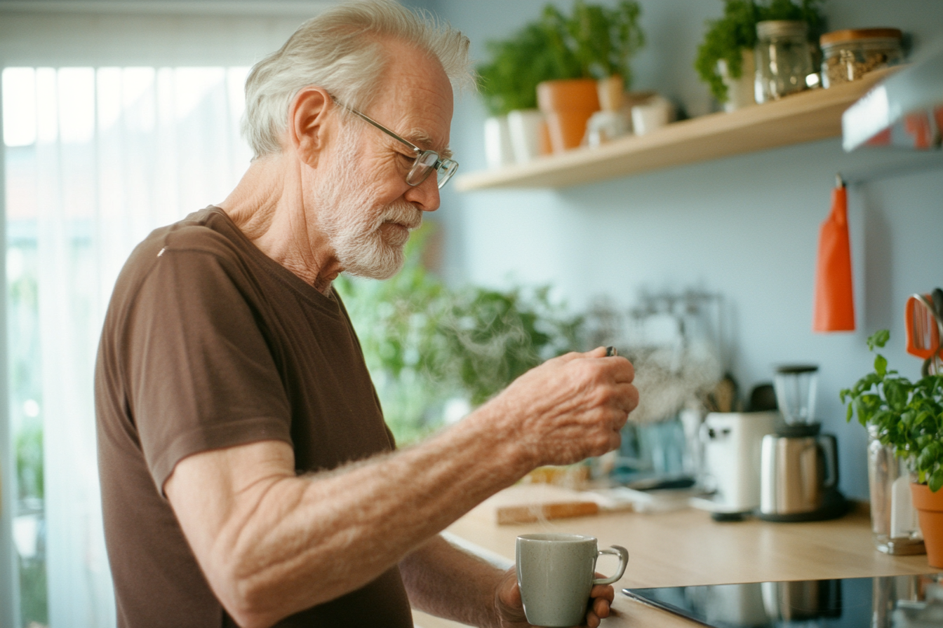 Irudiak gizon zahar bat erakusten du sukalde argi eta moderno batean, egurrezko poltsak txukunekin enborraturik. Gizonak, kameleta marroi bat darama eta aho zilarreko aho bat du, esku batekin kopa bat darama, bestearekin, aldiz, kopa barruan zerbait aztertzen edo nahasten ari dela dirudi, zeinak bere edaria prestatzeko arazorik gabe gozatzen ari den adierazten duena. Sukaldea landare berdeak loreontzietan dekoratuta dago, inguruan estalgarri eta naturaleko xarma bat gehituz. Atzekaldean sukalde-tresnak eta kafetegia ikus daitezke, erabiltzen den leku bat dela irudikatuz. Leihoa sartzen den argiak epel eta lasai sentimendu bat gehitzen du, atseden hartu-gune bat azpimarratuz.