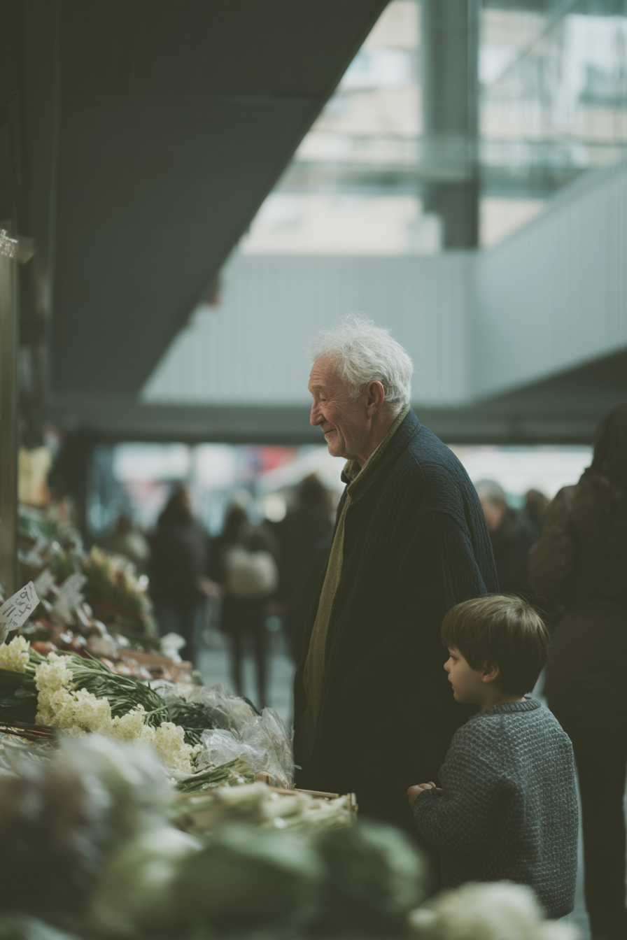 Irudiak merkatuan adineko gizona eta haur bat erakusten ditu. Adinekoak ile zilar kolorekoak eta jantziko ilun batekin, kontsumoan dauden produktu fresko batzuk zainduz begiratzen du. Bere alboan, haurra, jertse griseko jertsea eta kezka ikuspegiarekin, gizona begiratzen ari denari interesatuta dagoela dirudi. Ingurua bizia da, hondoan dagoen jende-itzale multzo batekin, baina arreta adineko gizona eta haur arteko interakzioan dago. Koloreak leunak dira eta espazioa argi natural batek argitzen du, beroa eta familia-osoarekin sentimendu bat sortuz eszenan. Komposizioak irakaskuntza eta adin-konexio generazionalaren une garrantzitsu bat irudikatzen du eguneroko ingurune batean.