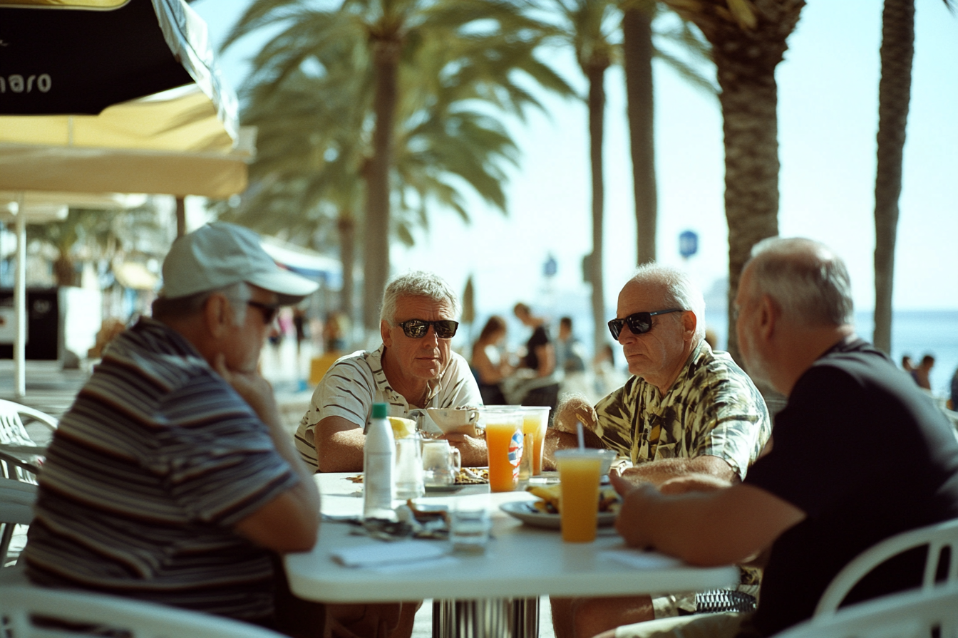 Irudiak lau gizonezko talde bat erakusten ditu mahai bat inguruan jolasten, aire zabalean, ombre batzuen azpian. Eguzki-egun batean jateko edo edateko ari dira, argi dago kostaldeko ingurune batean daudela, palmerak eta jendea paseatzen ikusten den atzeko planoa dela. Gizonek estilo ezberdinak dituzte, batzuk eguzki-antzekoak eta arropa ohikoak erabiliz, ingurua lasai eta lagungarri ikusten duena. Mahaiak zuriak dira eta aulkietan plastikoak, hondartzetako leku informaletan ohikoak direnak. Inguruan, itsasoa ikus daiteke atzeko planan, eta eszenak bizikidetza eta bizitza gozatzea sentiarazten du. Koloreak beroak eta distiratsuak dira, eguzki-egun baten isla ikusten dutela erakusten.