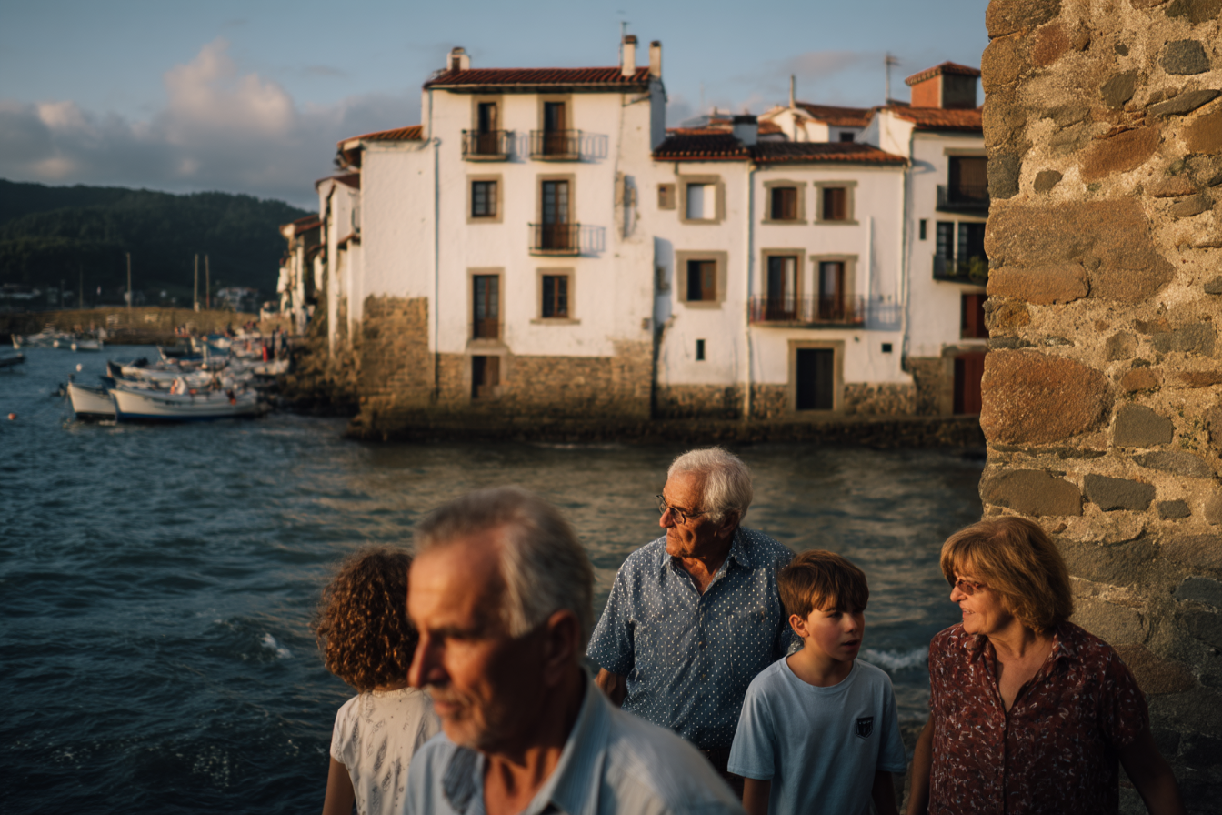 Irudia momentu idiliko bat harrizko portuan harrigarria, non hainbat pertsona bilduta dauden itsasertzean, atzian, etxe tradizionalak ikus daitezke, aurrealde zuri eta teilak gorriak dituztela, eskenezko estilotik toki erromantiko bat gehituz. Urak pixka bat harrapatuta dago, ilunabarraren distirak islatzen ditu, egunsentiko argi urrezkoak sortuz, eguraldi bizi eta adeitsua sortuz. Aurrealdean, adin ezberdinetako pertsonen taldea, familia bat osatzen dutela dirudi, elkarrekin interaktuan daude; beraien aurpegiei alaitasun eta konexioa adierazten dute. Haur bat irudiko erdian dago, horizontea begiratzen. Atzekaldean mendizuriak ikusten dira, ingurune natural ikusgarri bat irudikatuz, itsasotik datorren ingurua osatzen duena.
