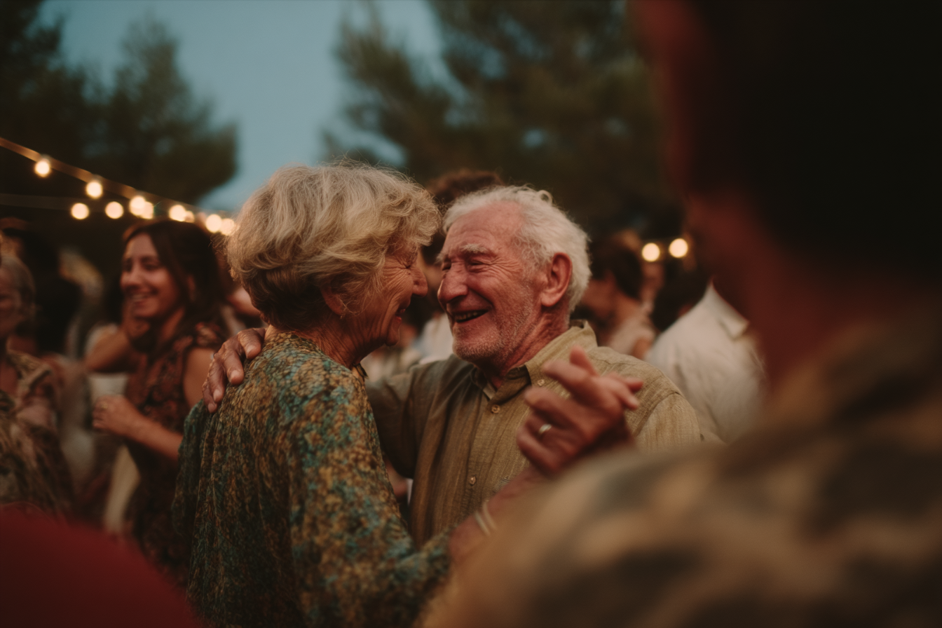 La imagen retrata a una pareja de ancianos disfrutando de un momento de baile en un ambiente festivo. Ambos lucen sonrientes, con expresiones de alegría y complicidad mientras se miran a los ojos. Ella lleva un vestido de tonos cálidos y su cabello es rizado y de color rubio, mientras que él viste una camisa de tono claro con un ajuste cómodo. En el fondo, se pueden ver luces colgantes que iluminan suavemente el ambiente, así como otras personas que parecen participar en la celebración. La escena evoca un sentido de calidez, amor y nostalgia, resaltando la conexión entre los dos. El entorno es natural, con árboles que aportan un toque de frescura y un cielo tenue que sugiere el anochecer. La imagen captura perfectamente la esencia de un momento especial compartido.