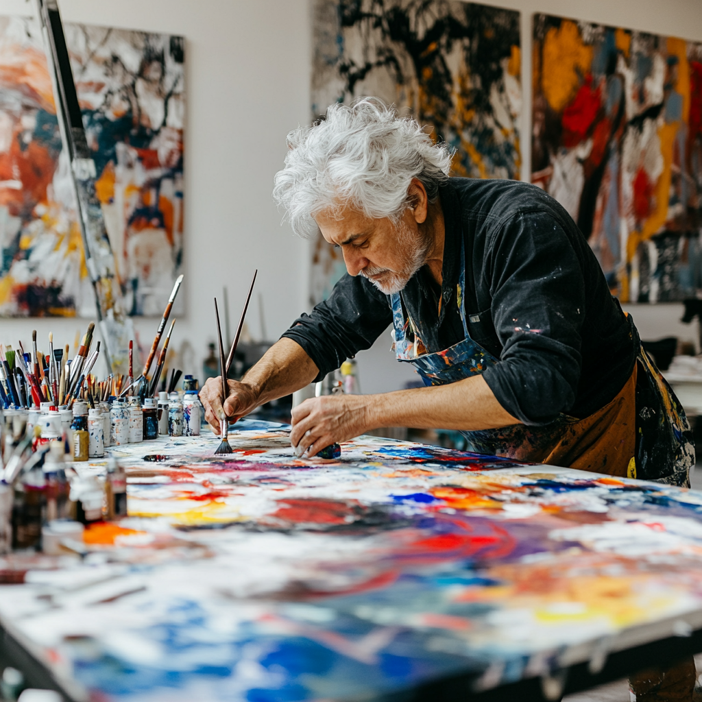 La imagen presenta a un artista de mediana edad trabajando concentradamente en su estudio. Está de pie frente a una mesa repleta de pintura y utensilios de arte, con una paleta vibrante que exhibe una variedad de colores brillantes como rojos, amarillos y azules. Su cabello canoso y rizado da un toque distintivo a su apariencia, mientras que viste una camisa oscura y un delantal que muestra manchas de pintura, evidenciando su dedicación al trabajo creativo. Detrás de él, se pueden ver varias obras en proceso colgadas en la pared, reflejando un entorno artístico lleno de inspiración. La escena captura la esencia del proceso creativo, transmitiendo tanto la pasión del artista como el vibrante caos que acompaña a la pintura.