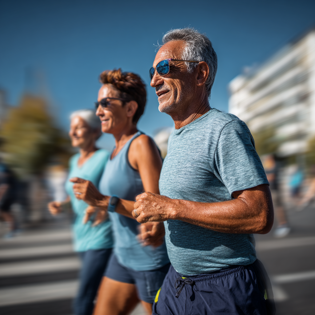 La imagen muestra a un grupo de personas de edad madura disfrutando de una carrera al aire libre en un día soleado. En primer plano, un hombre de cabello canoso y corto, con gafas de sol, sonríe mientras corre. A su lado, hay dos mujeres que también parecen estar disfrutando de la actividad; una de ellas lleva gafas oscuras y la otra tiene el cabello gris. Todos están vestidos con ropa deportiva ligera y colorida, adaptada para hacer ejercicio. El fondo muestra una calle con edificios y árboles difuminados, indicativo de un ambiente urbano. La escena transmite una sensación de vitalidad y actividad, destacando la importancia de mantenerse activo y saludable en la tercera edad.
