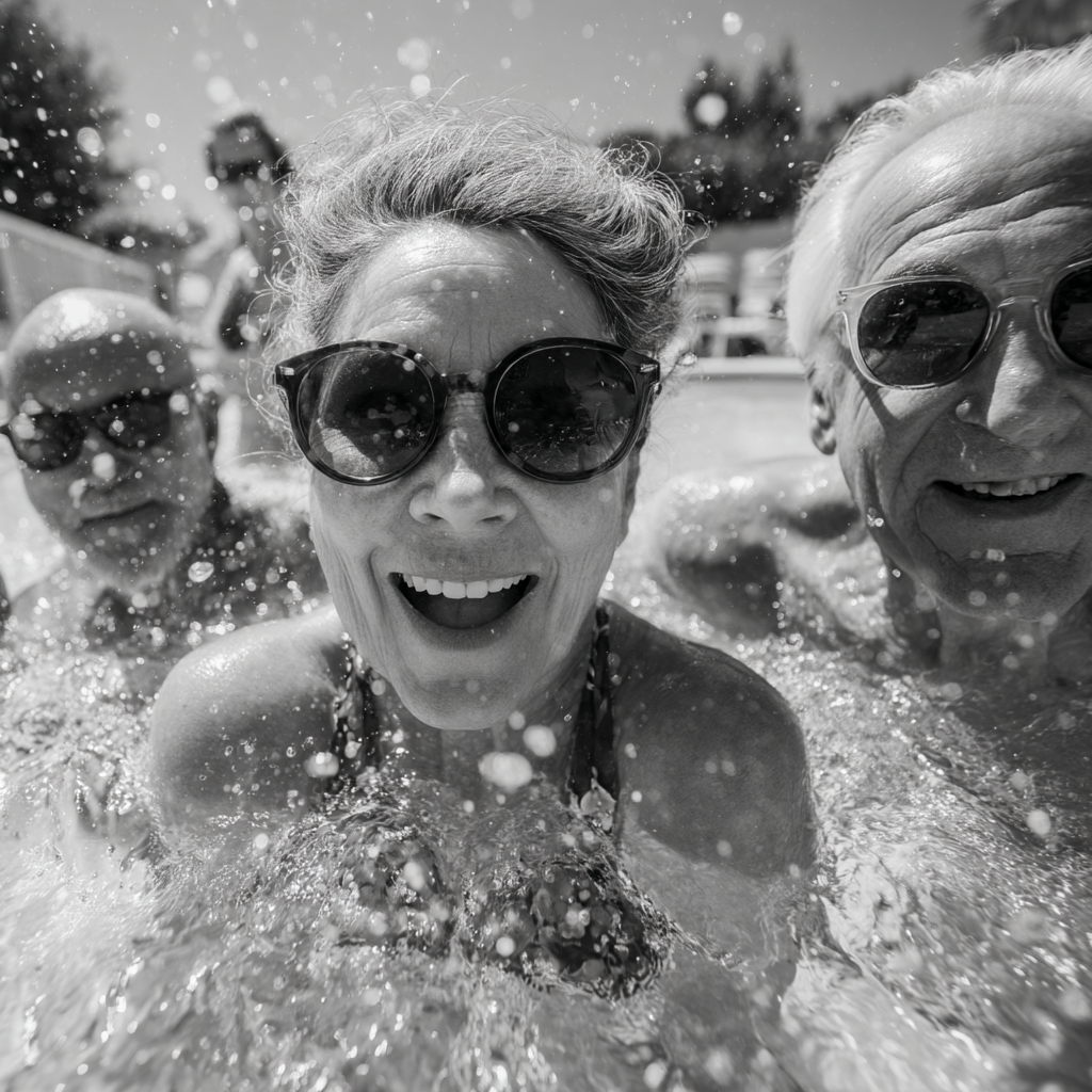 La imagen muestra a tres personas disfrutando de un momento divertido en una piscina, en una escena que parece capturada en un día soleado. Dos hombres, que se encuentran en el fondo, y una mujer, en el primer plano, todos con gafas de sol, están riendo y sonriendo mientras el agua salpica a su alrededor. La mujer parece estar disfrutando especialmente del momento, con una gran sonrisa en su rostro. Se puede ver la textura del agua y las burbujas que forman un efecto dinámico en la fotografía. El fondo muestra parcialmente a una cuarta persona, lo que sugiere un ambiente social y alegre. La imagen está en blanco y negro, lo que agrega un toque nostálgico y artístico a la escena.