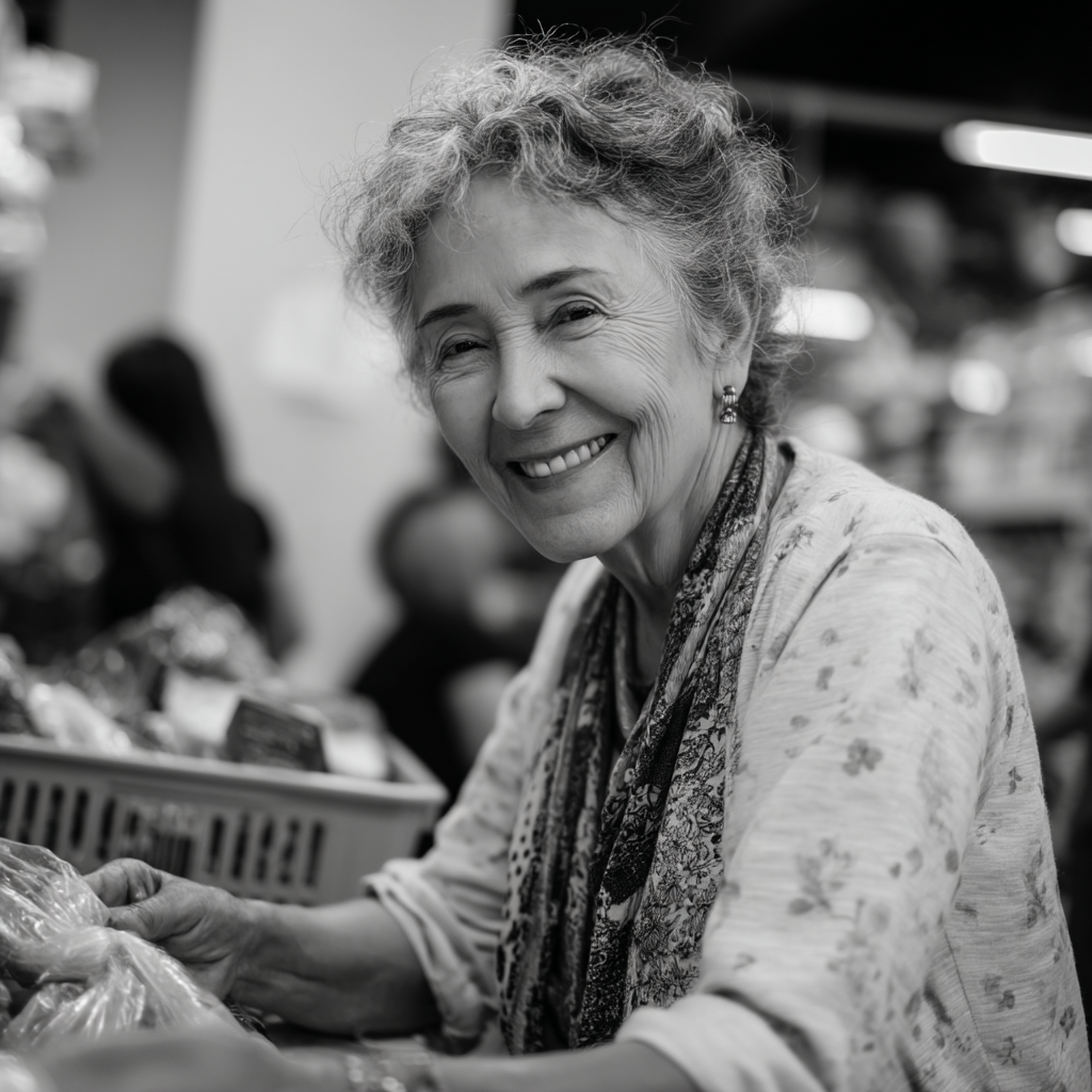 La imagen en blanco y negro muestra a una mujer mayor en un ambiente de mercado. Su rostro refleja una expresión amigable y cálida, con una sonrisa que irradia alegría. Tiene el cabello rizado y canoso, lo que sugiere sabiduría y experiencia. La mujer está inclinada hacia adelante, aparentemente disfrutando de su actividad al aire libre. Lleva puesto un atuendo claro, adornado con un chal que presenta un patrón delicado. Al fondo, se pueden observar otras personas en el mercado, aunque sus rostros no son claramente visibles, lo que centra la atención en la mujer. La escena evoca un sentimiento de comunidad y cotidianidad, destacando la importancia de los mercados locales como espacios de encuentro.